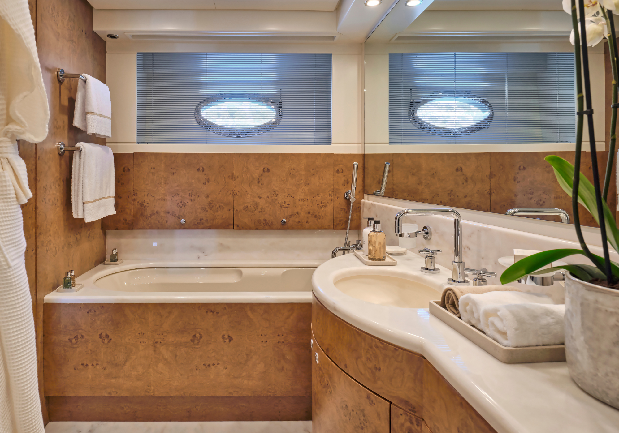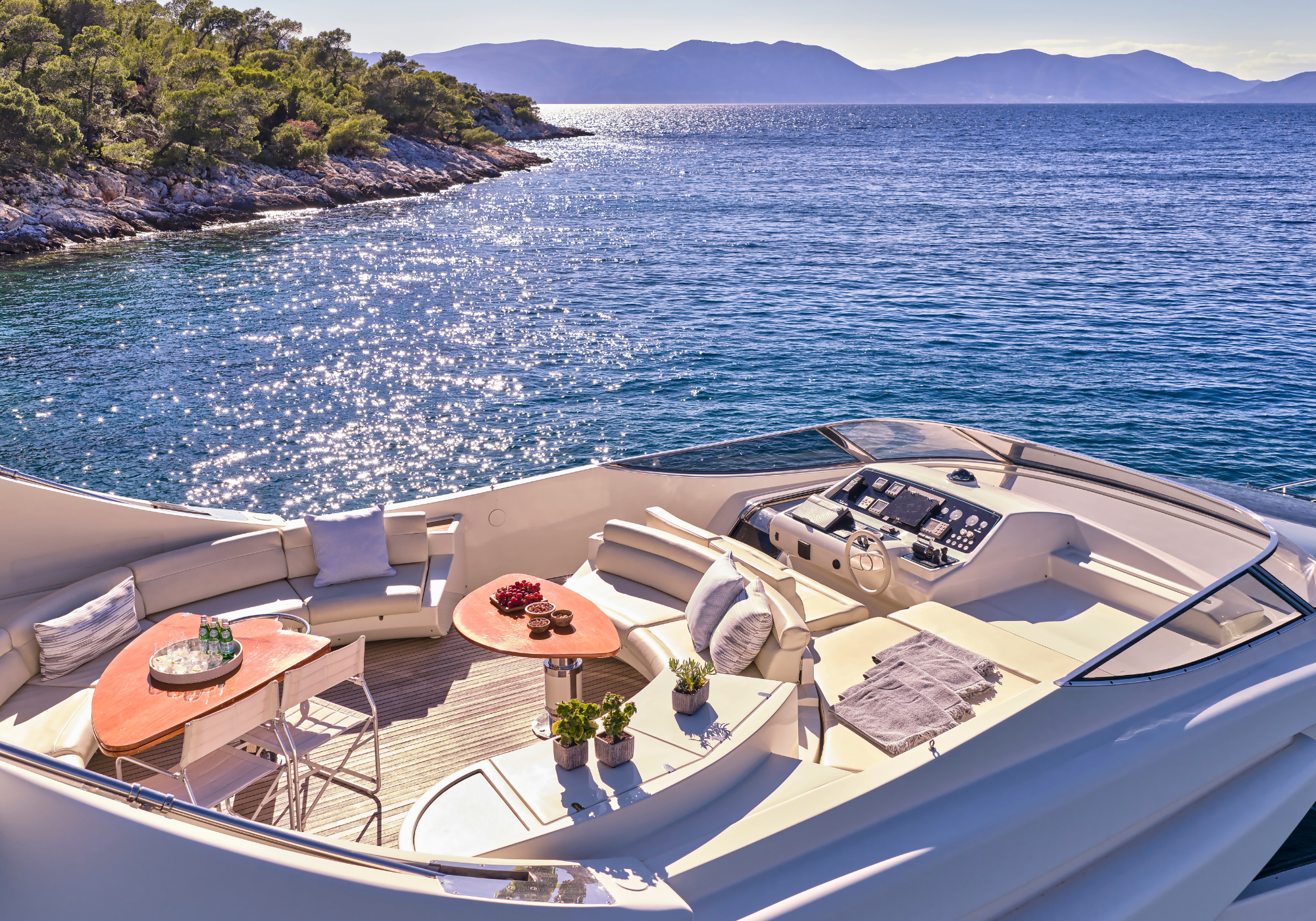 The main deck aft offers a great al fresco dining area, shaded by the flybridge overhang, plus there are steps down to the water’s edge swim platform. On the foredeck there is a double sun pad with views out across the bow.