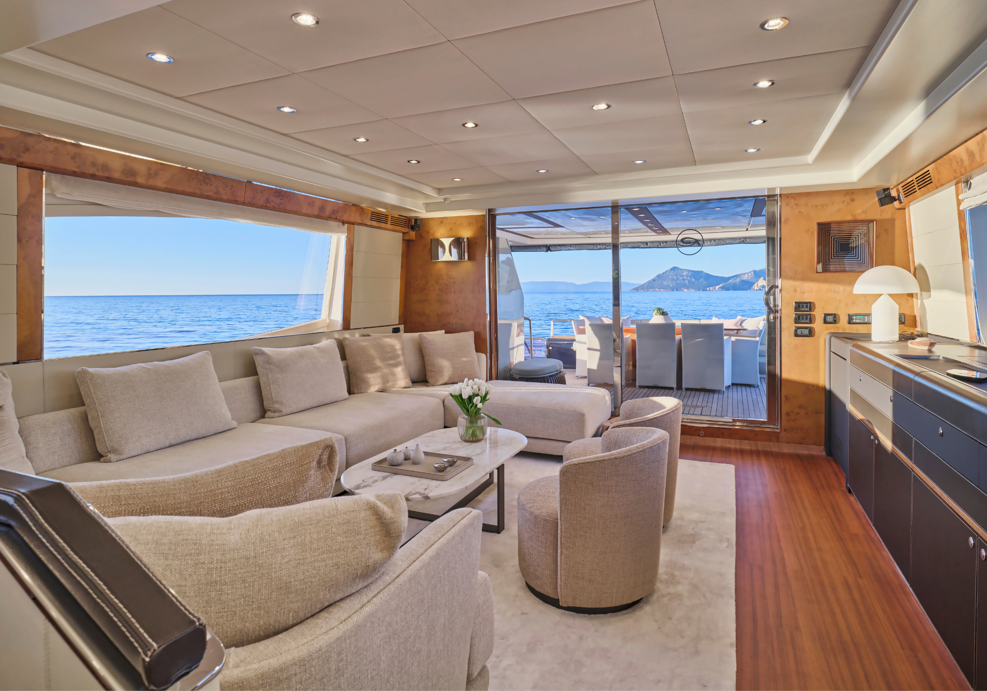 The light and bright interior blends wood floors with leather panelling and a neutral colour palette. In the main salon there is a lounge aft with a u-shaped sofa surrounding a coffee table and facing a wide panoramic window.