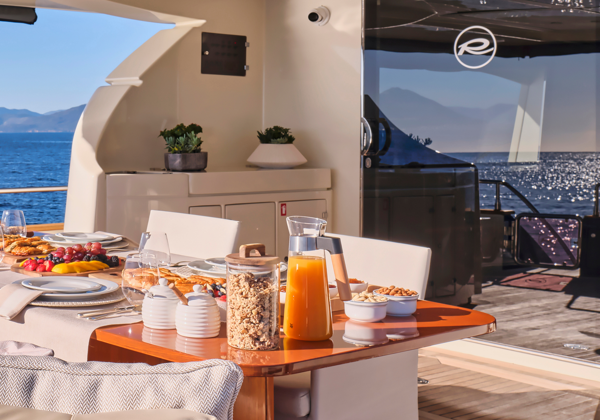 The main deck aft offers a great al fresco dining area, shaded by the flybridge overhang, plus there are steps down to the water’s edge swim platform. On the foredeck there is a double sun pad with views out across the bow.