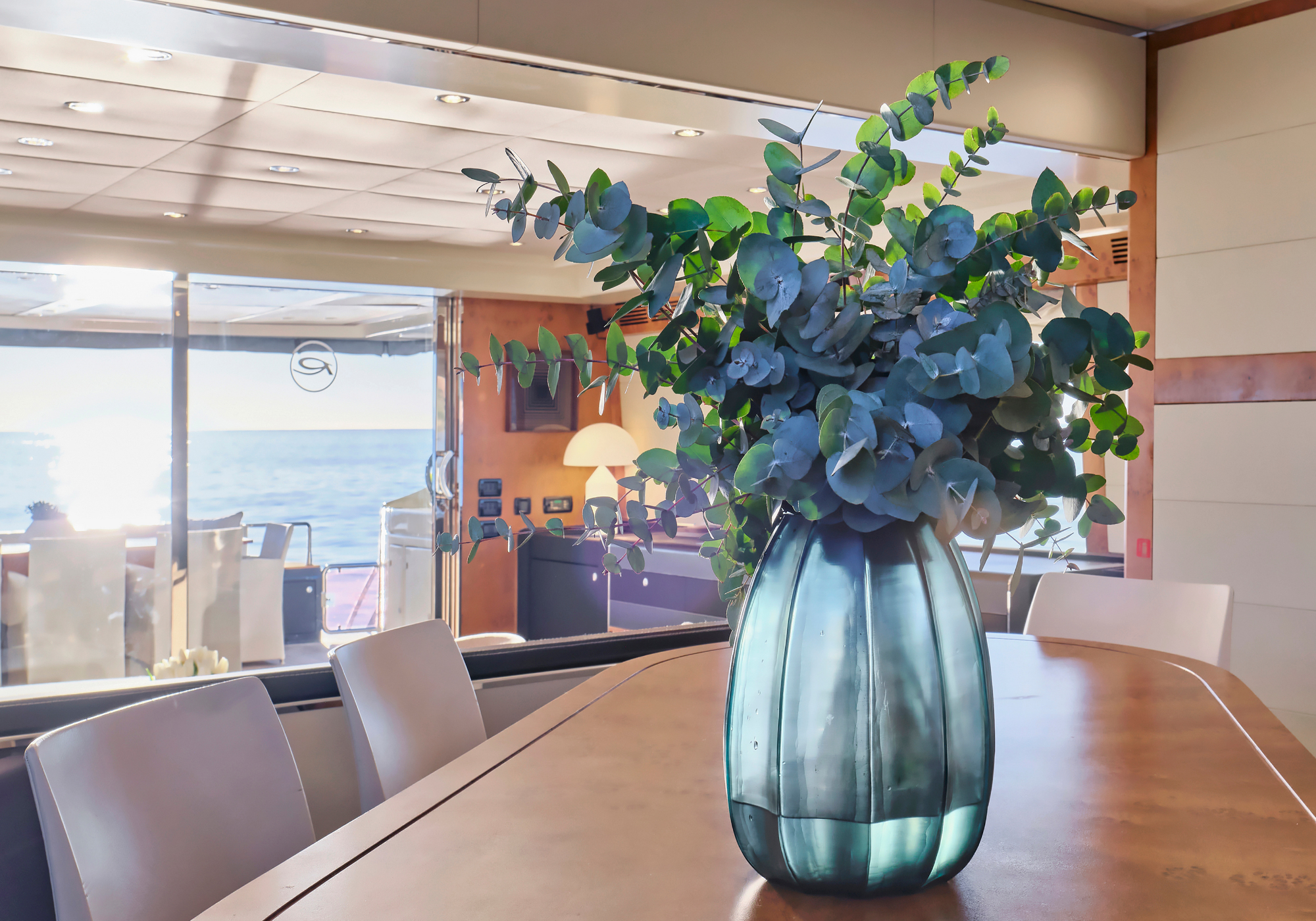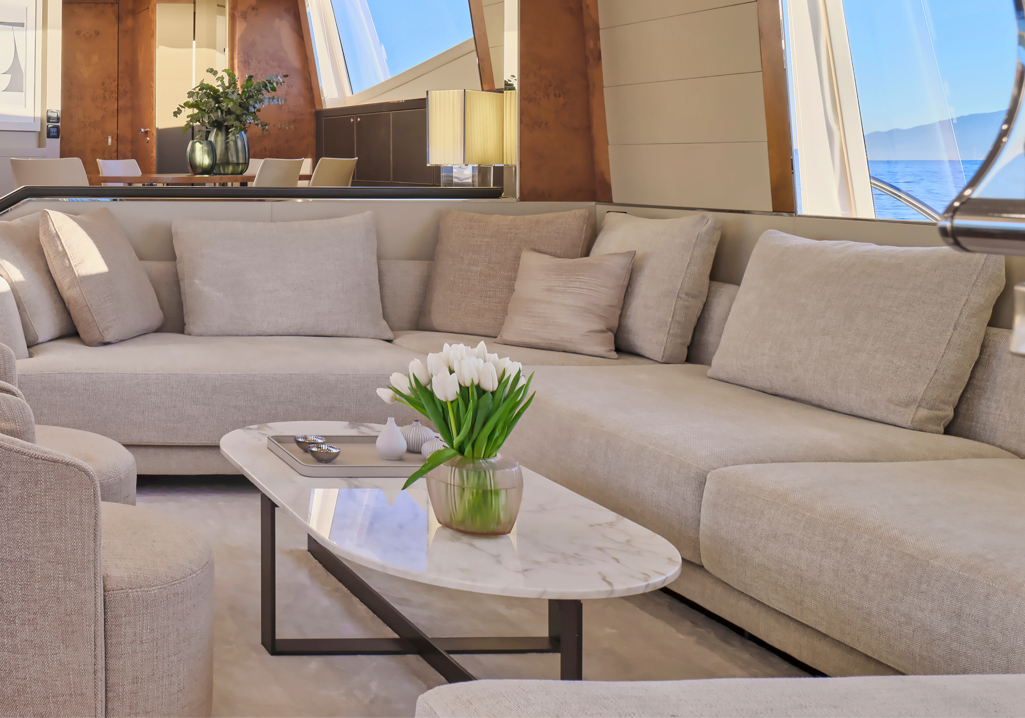 The main deck aft offers a great al fresco dining area, shaded by the flybridge overhang, plus there are steps down to the water’s edge swim platform. On the foredeck there is a double sun pad with views out across the bow.