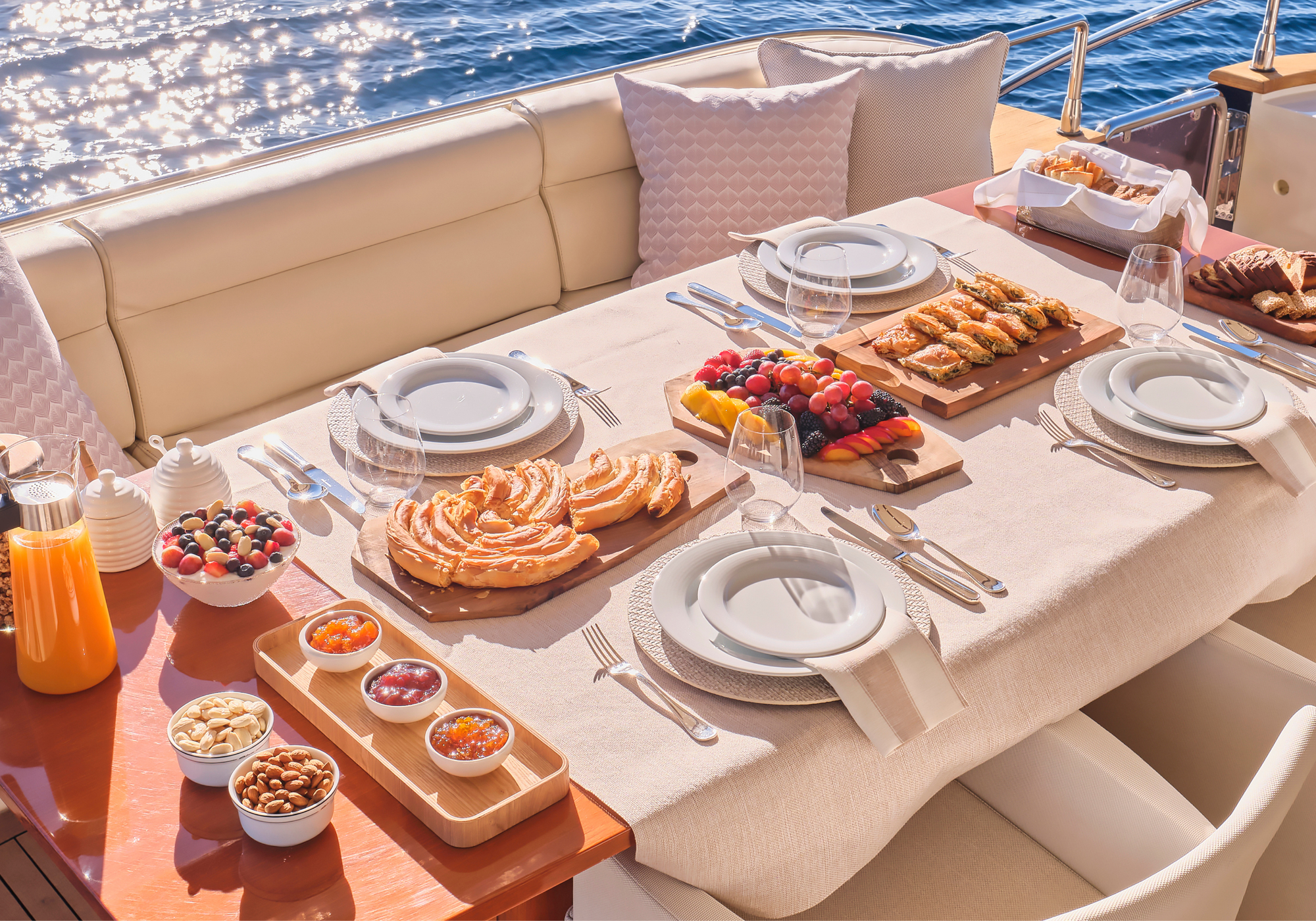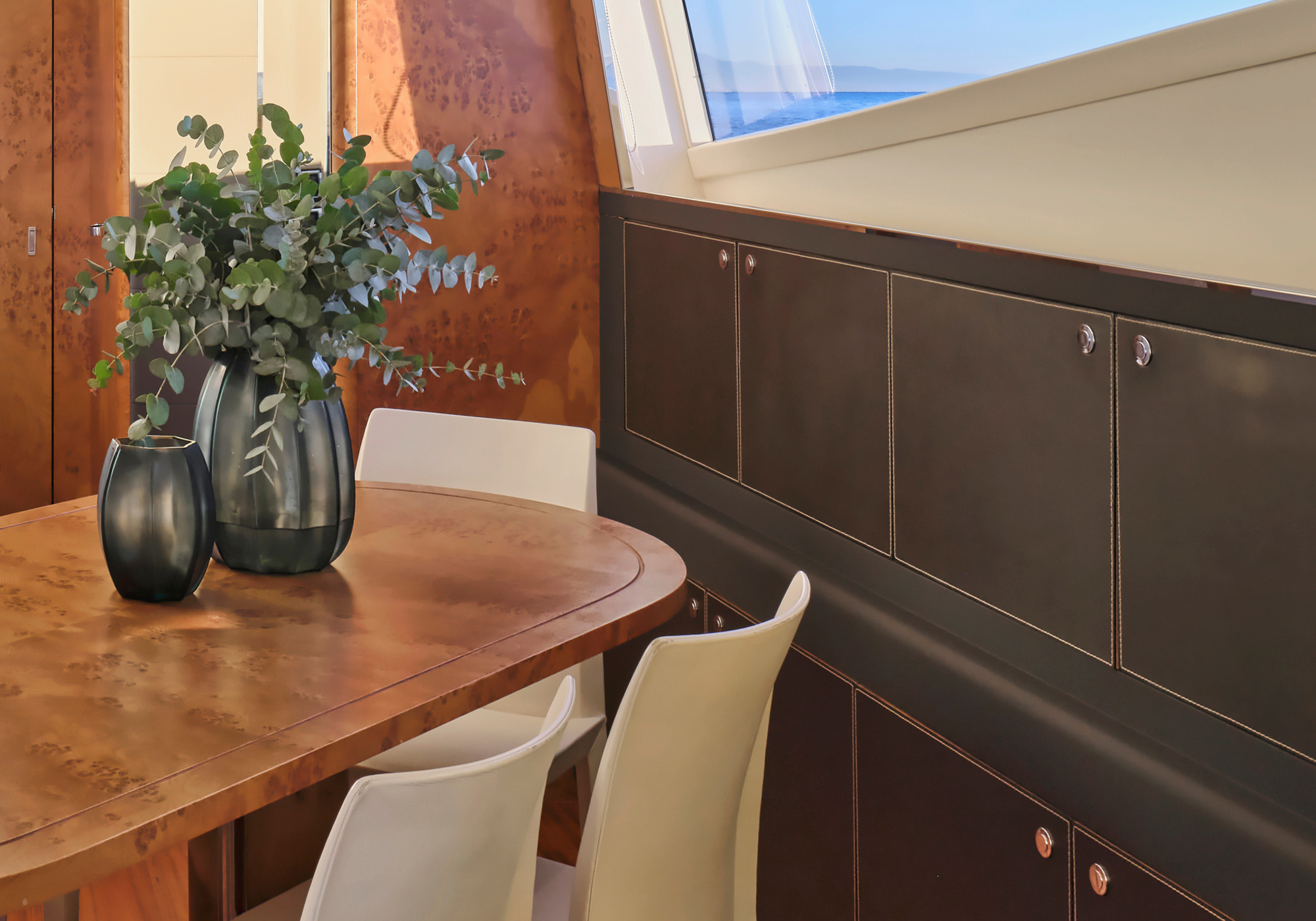 The main deck aft offers a great al fresco dining area, shaded by the flybridge overhang, plus there are steps down to the water’s edge swim platform. On the foredeck there is a double sun pad with views out across the bow.
