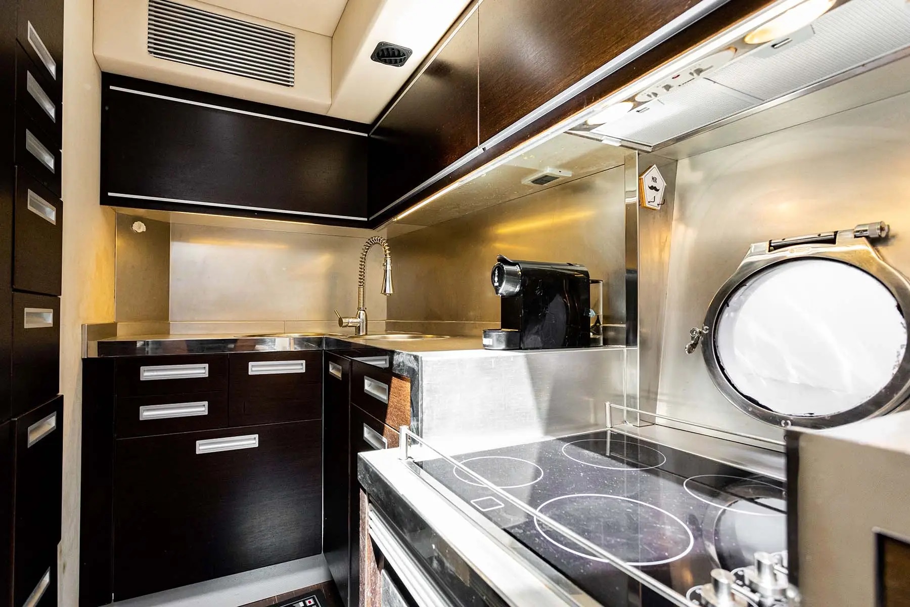 Forward to port are the helm controls and to starboard steps lead down to the cabins and the galley. The three suites are configured as a master, VIP and twin, all with ensuite bathroom facilities. The master suite also boasts a banquette seating area and table.