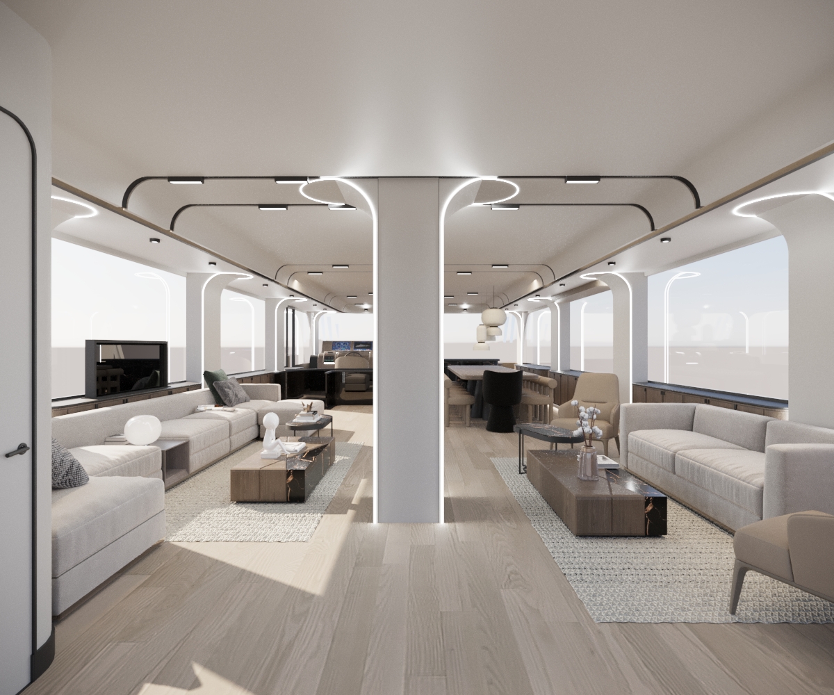 The contemporary main salon offers everything guests could need, zoned for lounging, dining, sitting up at the bar and an integrated helm.
