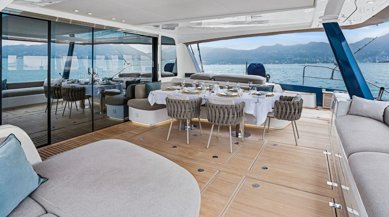 NOTABLE FEATURES OF MANE ET NOCTE: ~Flybridge sailing catamaran ~Foredeck jacuzzi ~Huge aft cockpit ~Private balcony in master suite ~Gym equipment and water toys ~Steinway piano ~Air conditioning ~WiFi