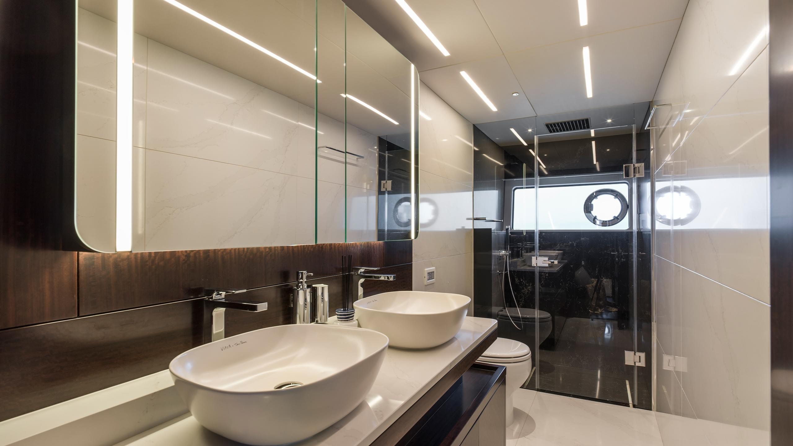 The master takes full advantage of the layout and features a lounge space, private dressing area and wardrobe and sizeable ensuite bathroom with double sinks. The VIP, in the bow, also boasts a walk around bed, dressing area/vanity and ensuite with double sinks.