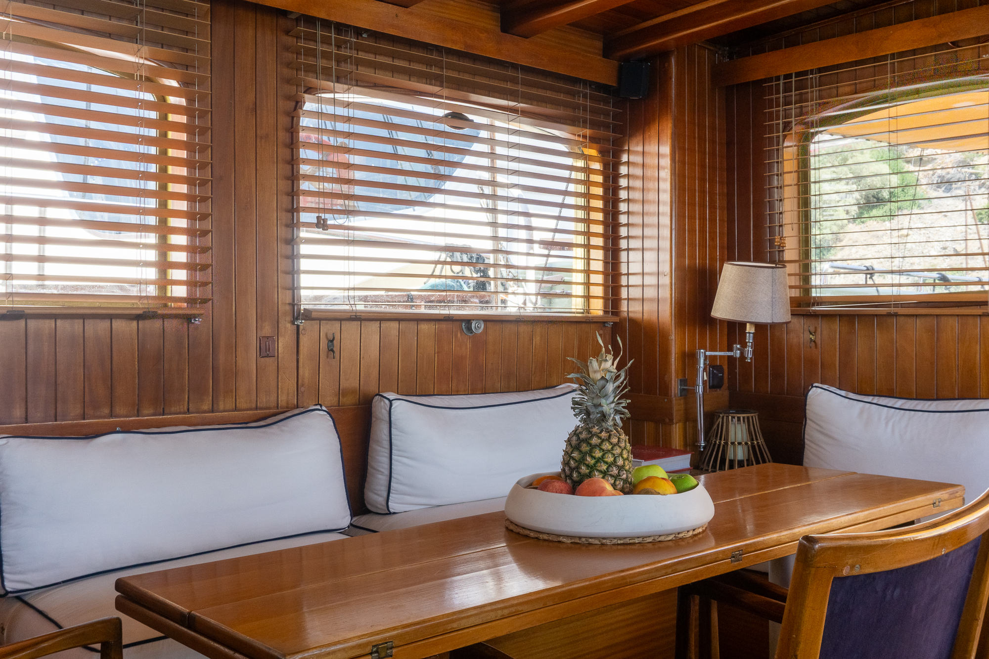The main salon is arranged with a corner sofa and chairs surrounding a dining table plus a modular sofa arrangement forward. The delightful cabins present with an authentic nautical style with dark wood finishes, crisp white linen and blue soft furnishings.