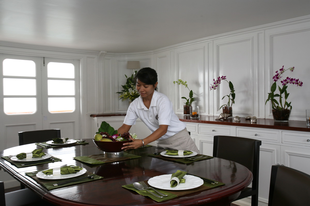 The Master stateroom with king sized bed and private ensuite features rich mahogany and contrasting tasteful colors providing grace and sophistication. The yacht also has two double staterooms, two twin cabins with ensuite showers/bathrooms and two single cabins with own bathroom. One of the single cabins is slightly smaller.