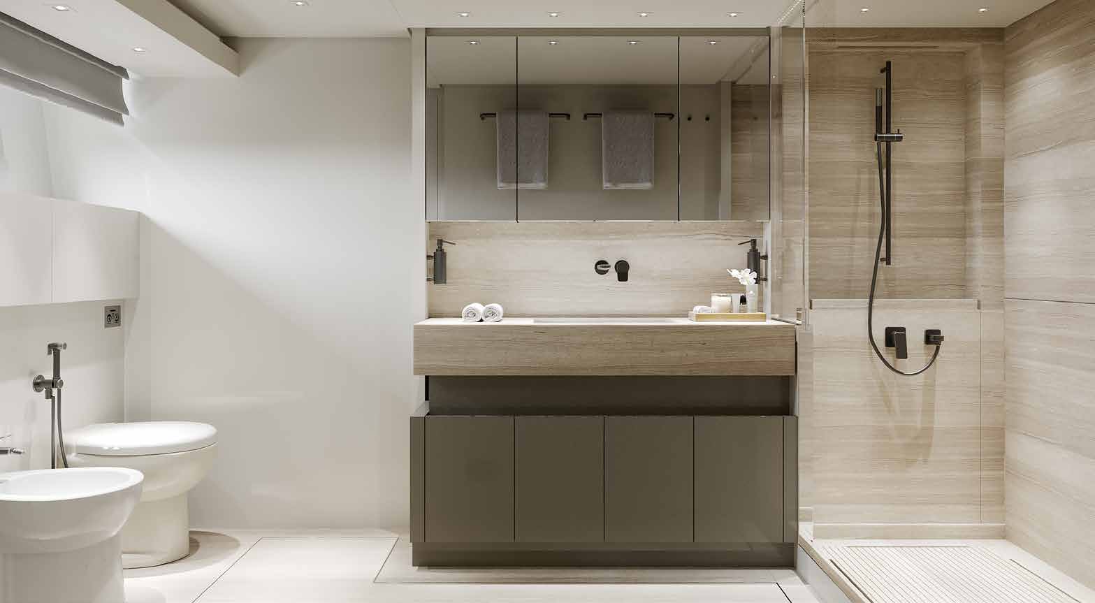 The warm and welcoming ensuite staterooms are configured as a full beam master amidships, two doubles and one twin. The master also includes a sofa to port and vanity/desk to starboard plus walk in wardrobe and luxury ensuite bathroom. The additional guest suites also benefit from the luxury and privacy of ensuite facilities.