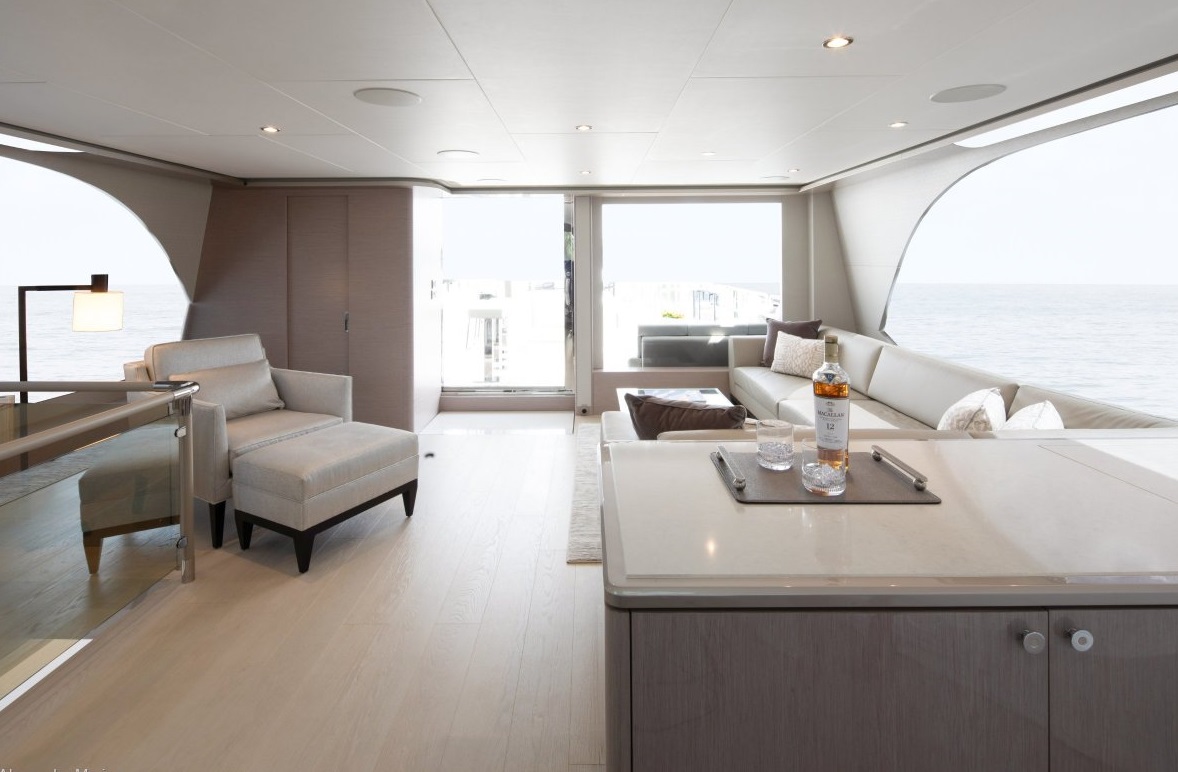 The open and light interior offers a lovely main salon plus an additional sky lounge. The main salon has light wood flooring and furnishings with high gloss and matt leather finishes configured as an aft lounge and forward dining area.