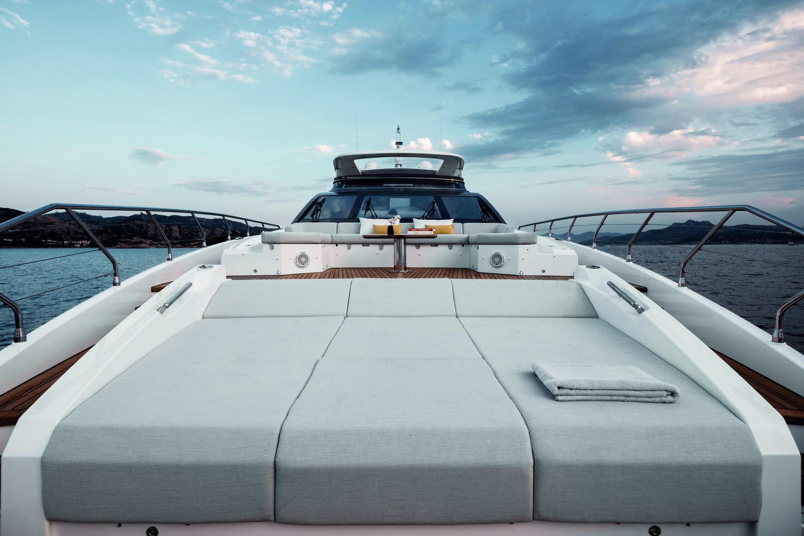Yet more sociable space is on the foredeck configured as a row of forward sun pads and a casual dining setting below the wheelhouse windscreen.