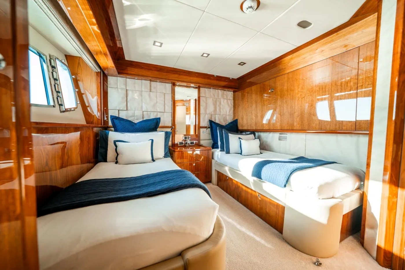 On the lower deck are two VIP queen cabins and one twin cabin. The twin cabin offers a Pullman berth for an additional guest.