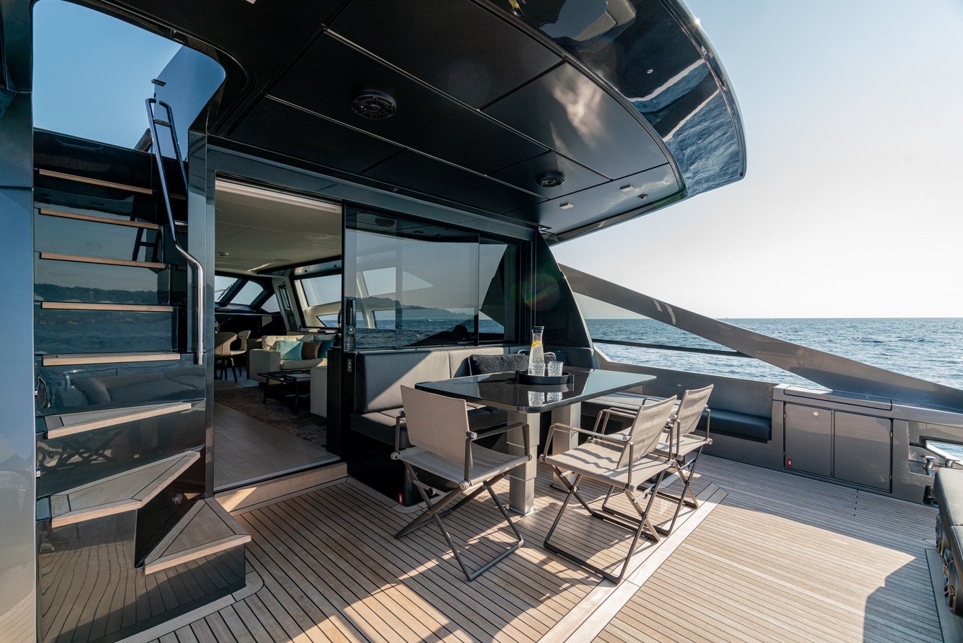 Her sporty lines are further enhanced by the large side wings and the aerodynamic profile of the sun deck.