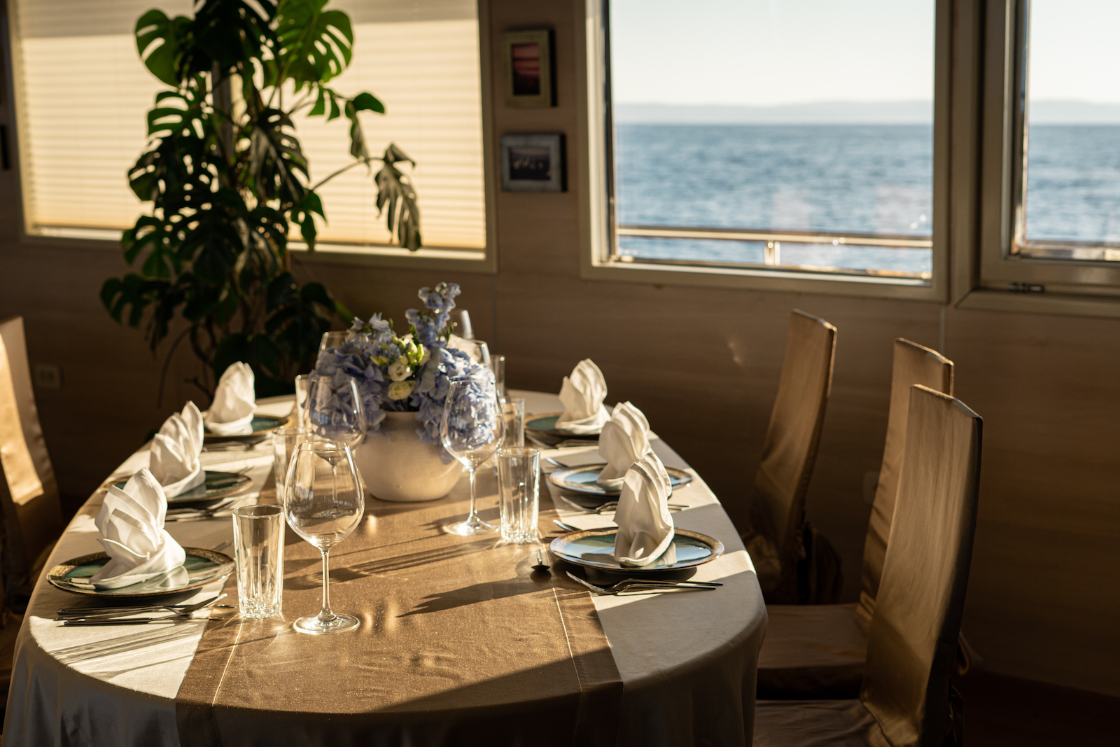 The stunning interiors are light and airy with the main interior salon being dedicated to dining. There are circular tables which can be arranged according to guests’ requirements and there is a bar and service area. The galley is located on the lower deck with direct private access for staff into the dining salon.
