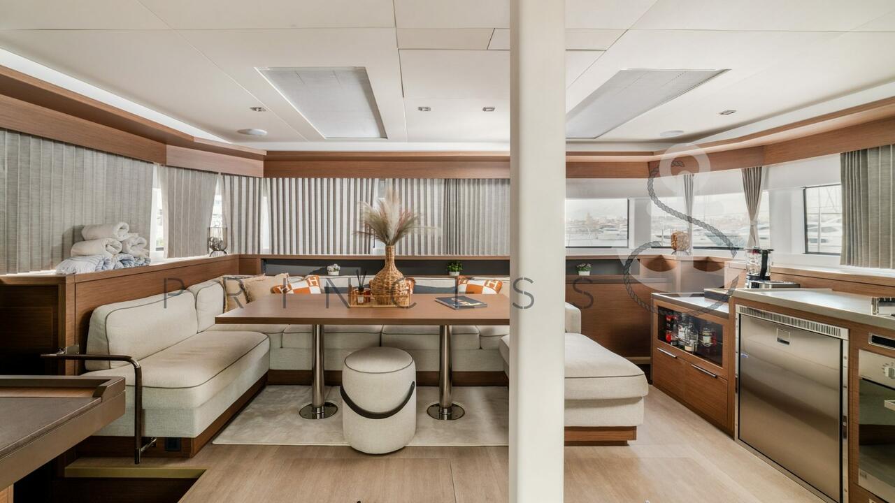 The salon is open plan including the integrated galley and a crew navigation desk. Windows on all sides fill the space with light and view. The four guest suites including a master, VIP and two additional double suites.