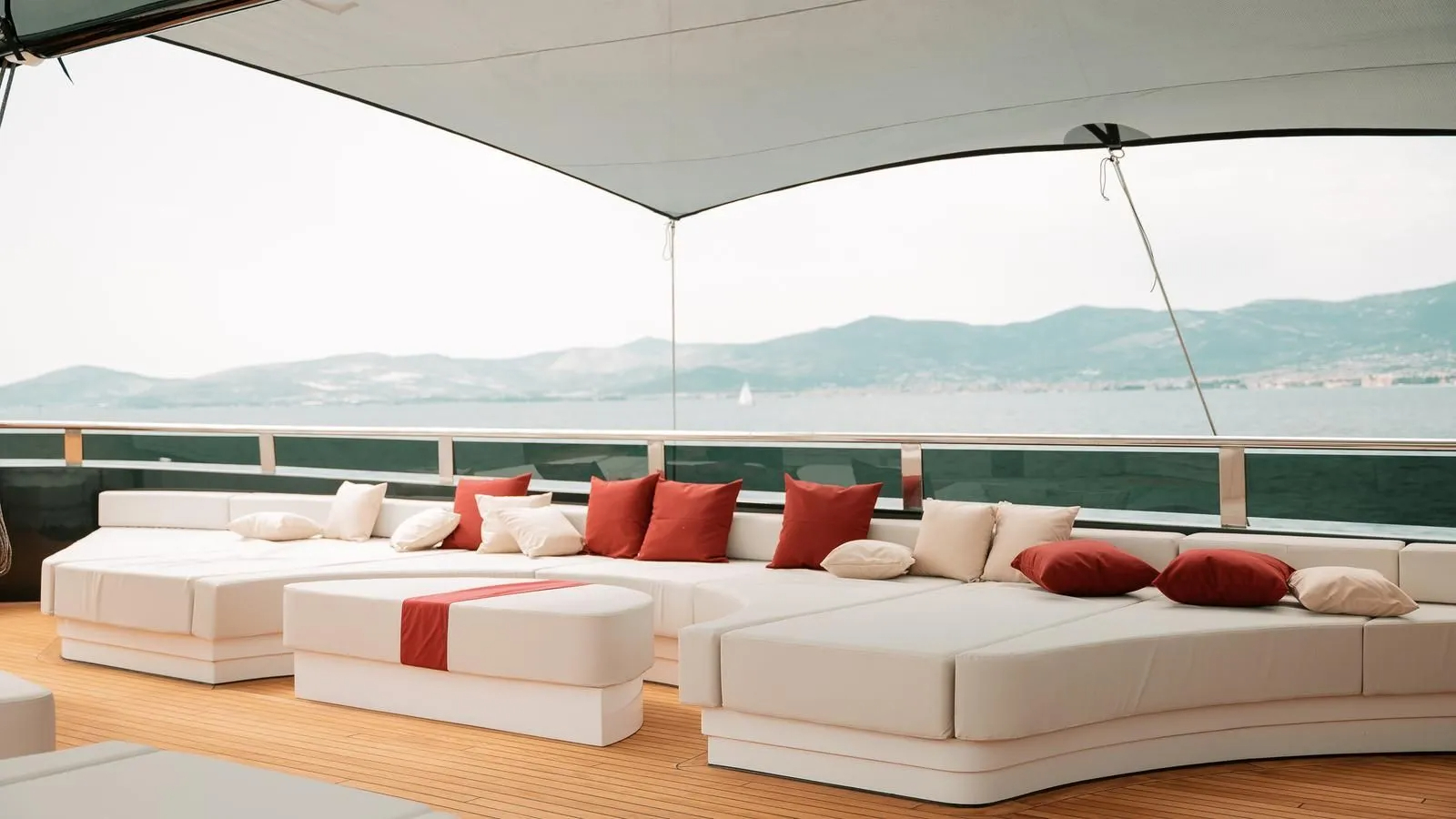 The contemporary flybridge design offers a vast sundeck and a superior quality interior with accommodation for up to 12 guests in six suites.