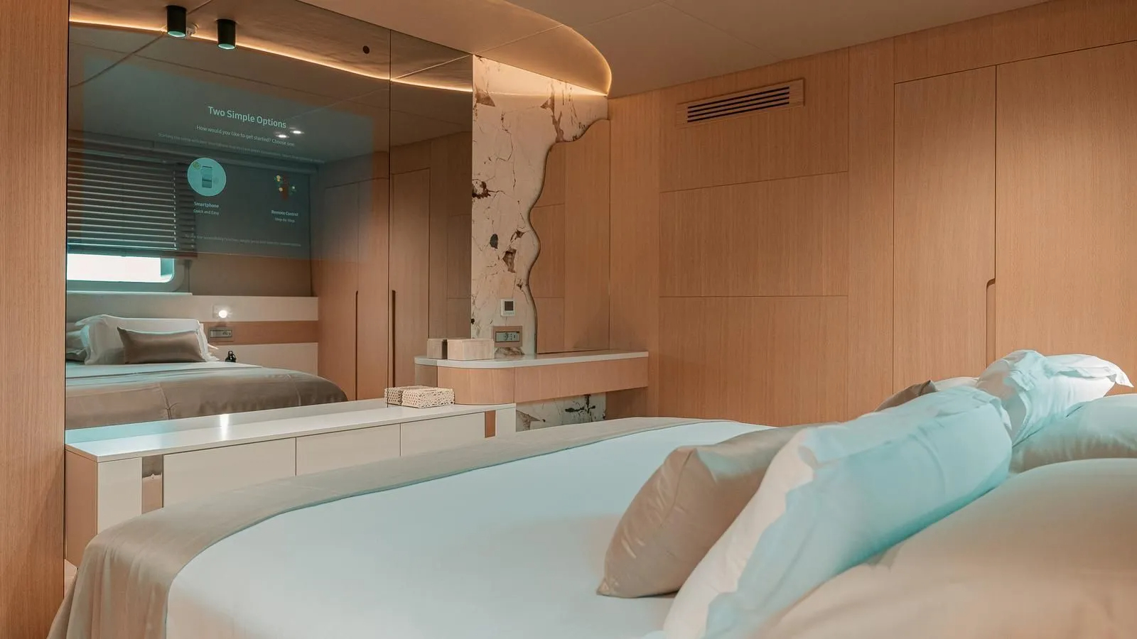 The contemporary flybridge design offers a vast sundeck and a superior quality interior with accommodation for up to 12 guests in six suites.