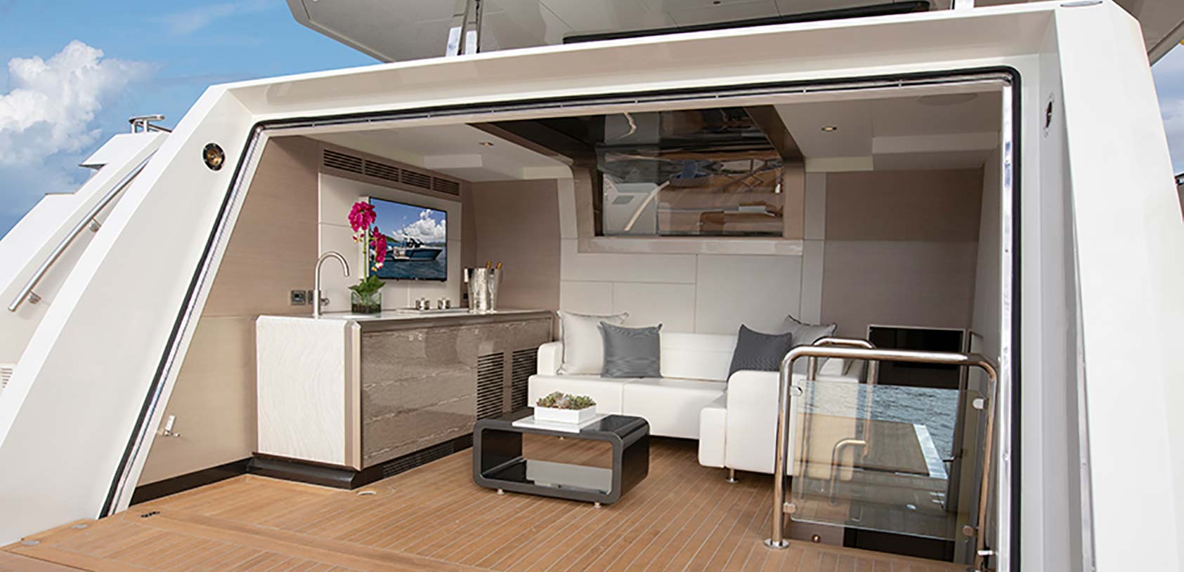 The main deck aft creates a cosy covered lounge with a comfortable u-shaped sofa and coffee table plus a central glass panel with views down into the beach club/swim platform.