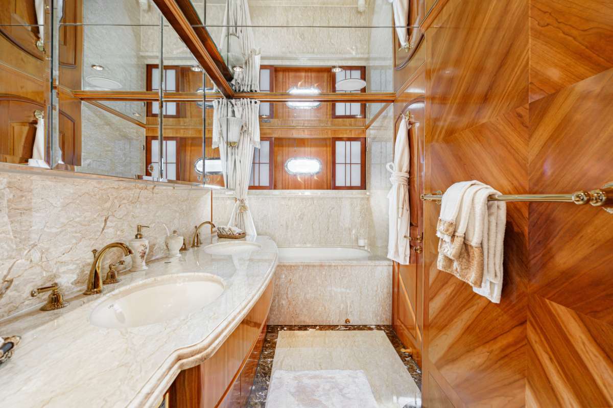 Accommodation is for up to six guests in three luxury staterooms with grand double-door entry , large California King berths, and granite-appointed ensuite heads. The master stateroom is especially large with a unique raised ceiling design.