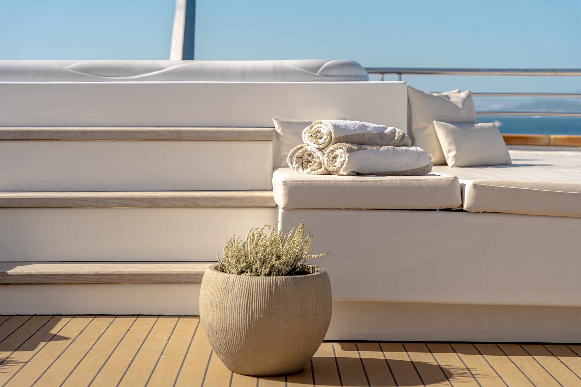 There is an abundance of exterior and interior entertainment space plus a host of luxury features including deck jacuzzi, expansive dining salon and eleven crew members.