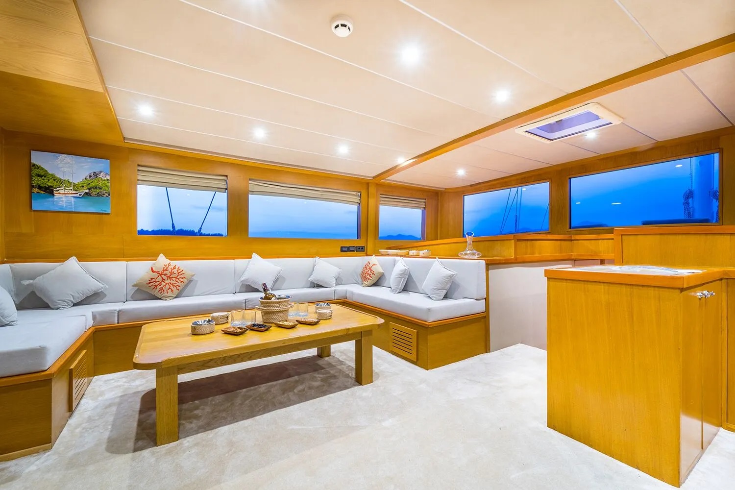 The main salon offers a flexible dining or lounge setting with a u-shaped inbuilt sofa surrounding a flexible table. On the starboard side is a bar and service area.