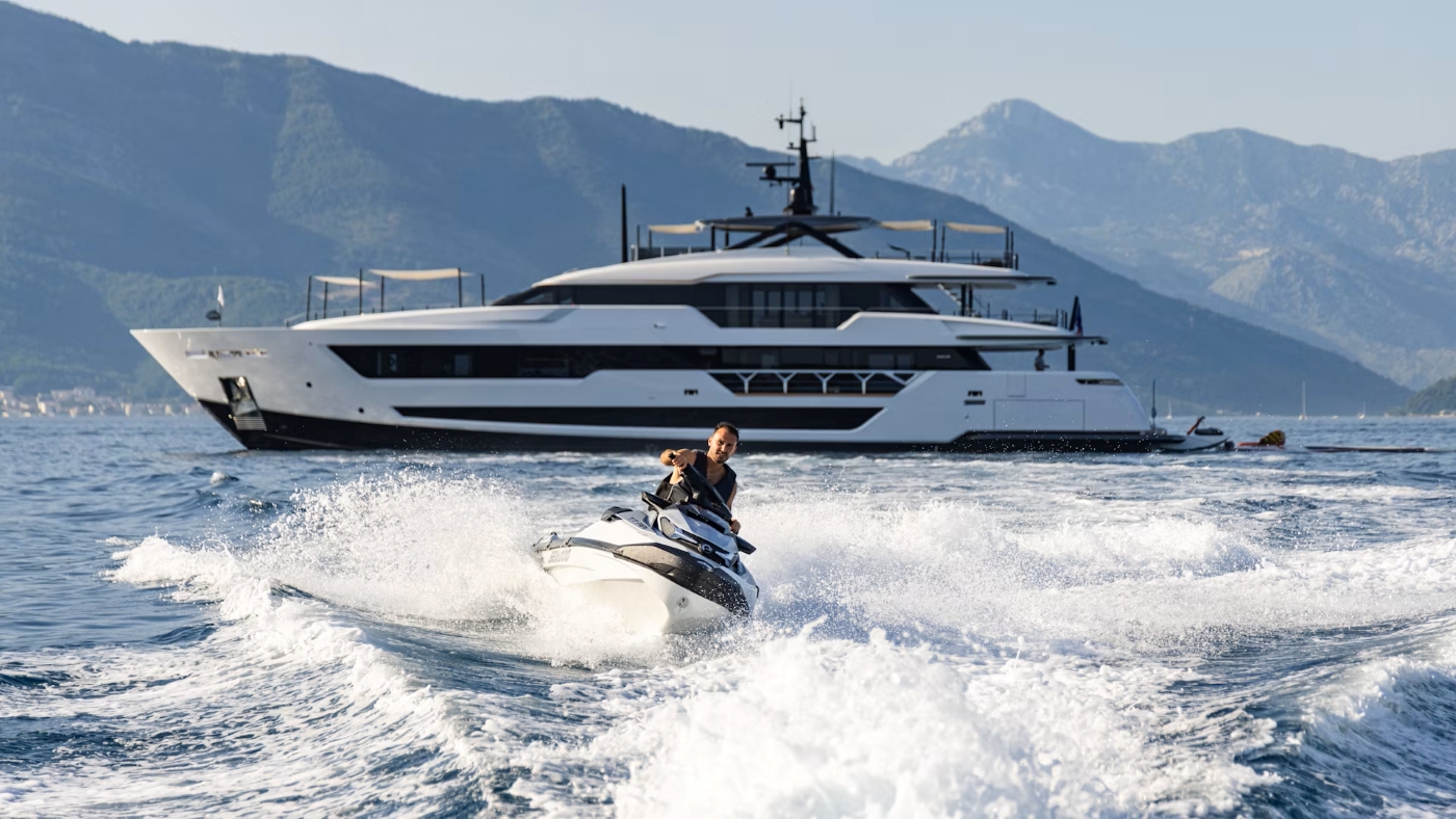 Steps lead down to the swim platform from where the crew will launch the water toys.