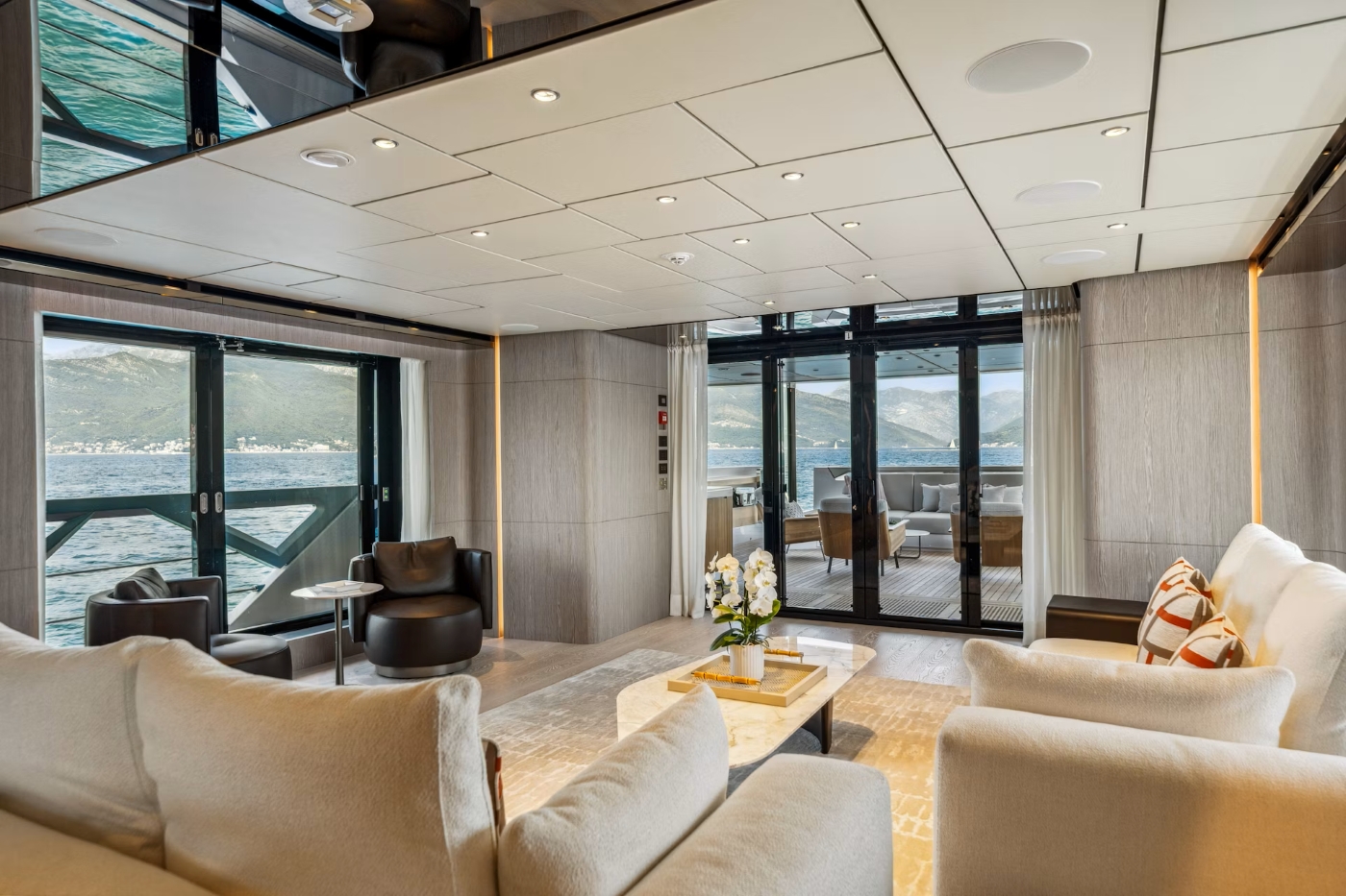 The main salon is stylishly decorated blending neutral soft furnishings with leather and matt wood finishes. Aft in the space is an L-shaped sofa and occasional chairs with a dining table for up to ten guests in the forward position. Wide, panoramic windows let lots of light in and offer glimpses of the surrounding scenery.