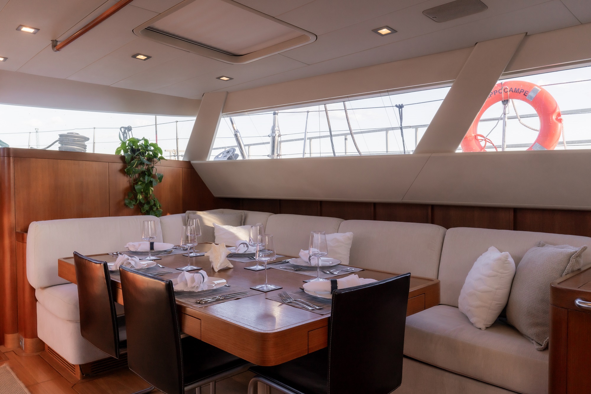 The central cockpit offers guests a covered u-shaped dining setting with a sun-padded area on the coach roof. The dual helm controls are aft, and an open deck area gives views across the stern and swim platform, created when the transom door opens.