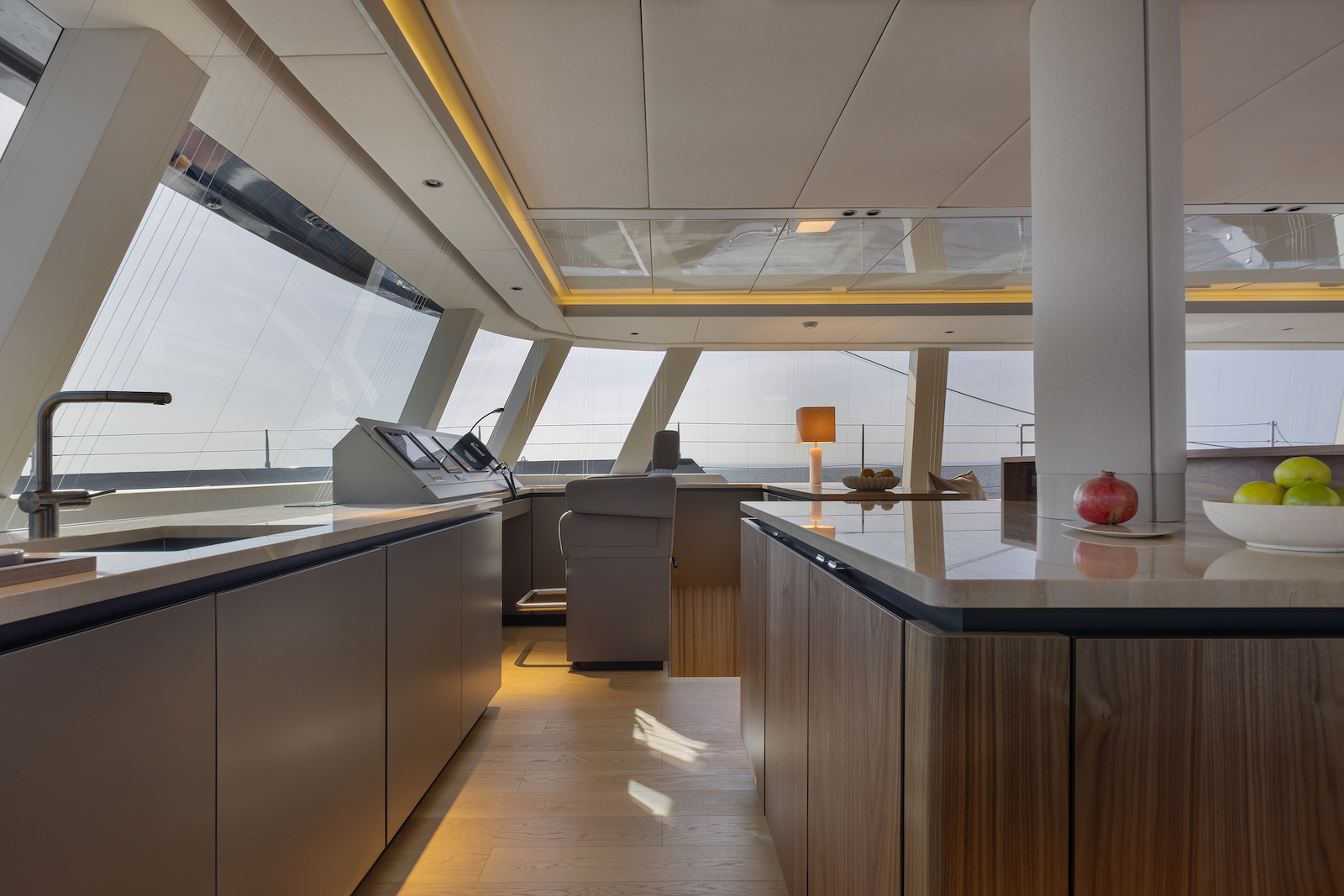 The galley is in the lower port hull with a dedicated crew staircase up to the main salon. The guest accommodation is across both hulls with the starboard hull configured with a forward double cabin, amidships master cabin and aft bunk cabin. In the port hull there are two double cabins forward from the aft galley.