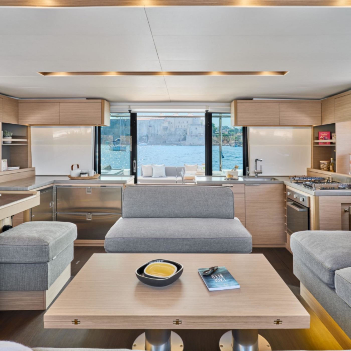The aft cockpit offers both dining and lounge spaces, plus steps down to the swim platform while the foredeck is a great space including a sofa with two chaise long cushions and two forward trampolines. Additional space is on offer on the flybridge which offer the best views on board.