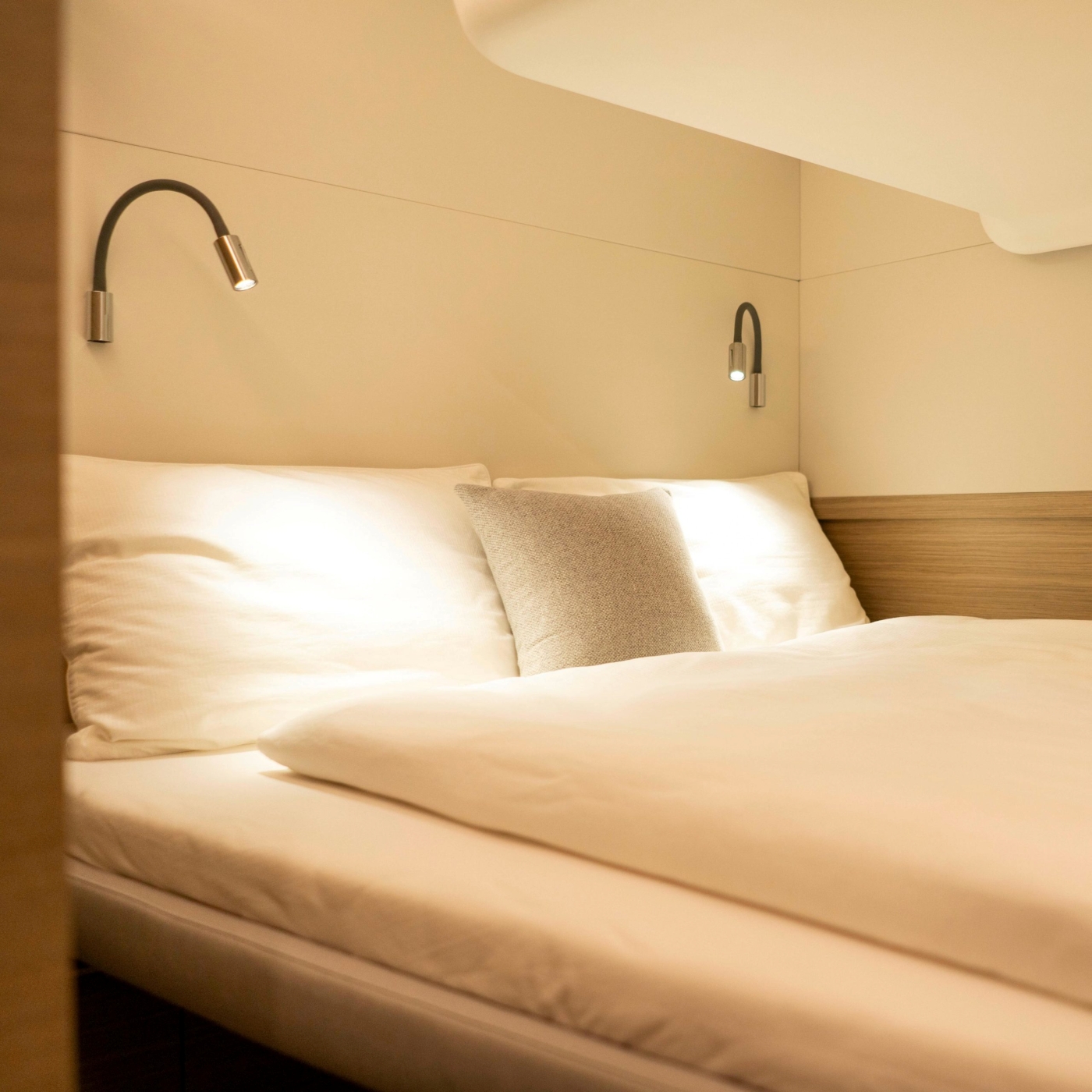 Accommodation is for up to six guests in three ensuite cabins across both lower deck hulls.