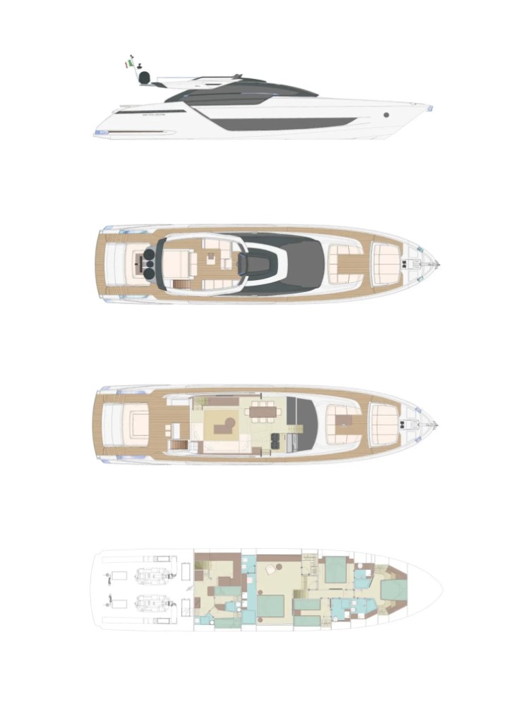Right Now) is a quintessential Riva sport fly yacht with a distinctive silver profile. She is 26.92 m (88' 4") in length, was built in 2021 and has been expertly maintained with a 2024 refit. Accommodation is for up to eight guests in four luxury suites plus additional cabins for the four crew members.