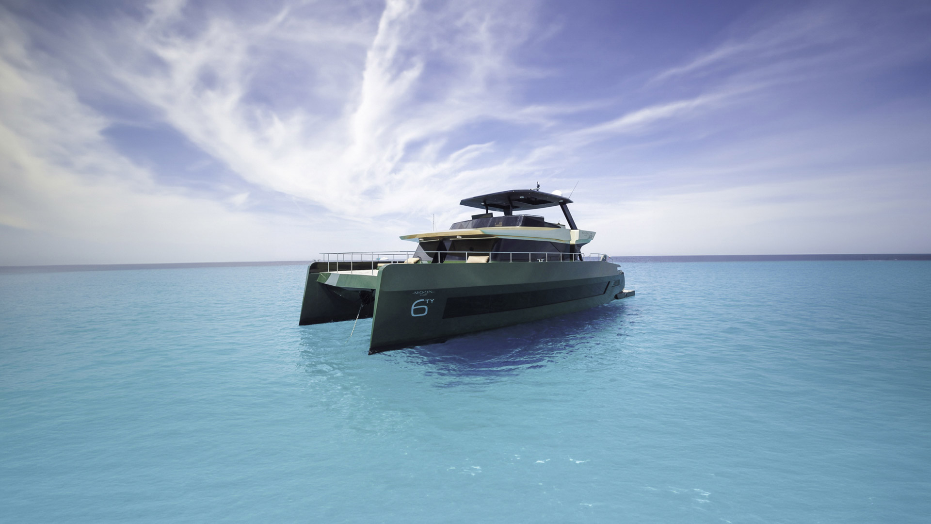 Motor yacht OVER THE MOON is a 19.33 m (63' 5") Moon 60 catamaran with a personalised design featuring a sophisticated racing green hull and cream and black superstructure. Offering grand spaces across the interior and exterior, she can accommodate up to eight guests in four suites and is managed by a crew of three.