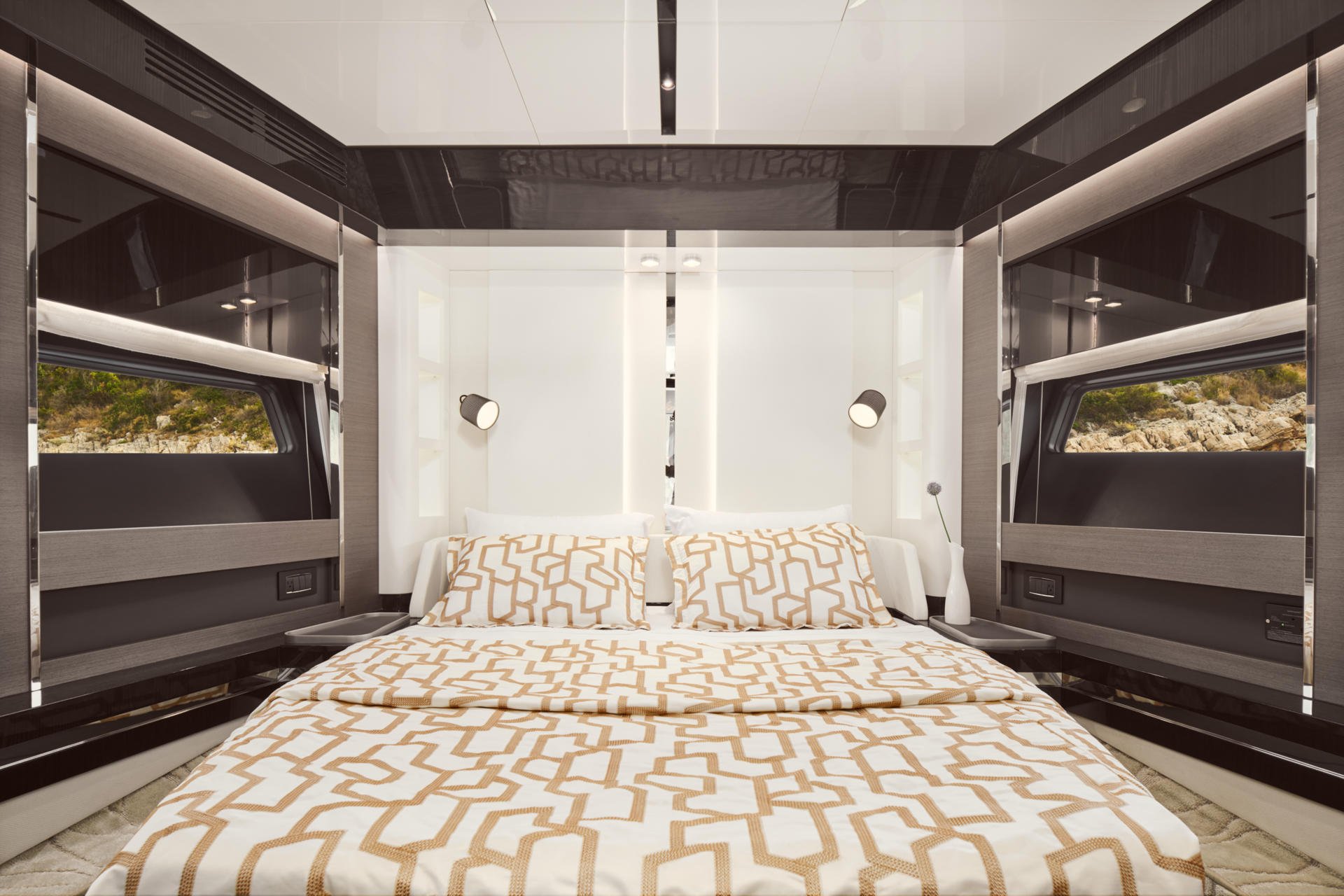 There are four suites on the lower deck including a full beam master amidships, a VIP in the bow and two twin cabins in between. The full beam master includes the main berth plus a sofa, vanity, ensuite bathroom and walk-in-wardrobe. The VIP has a walk around bed and ensuite bathroom while the port and starboard twin cabins also have ensuites.