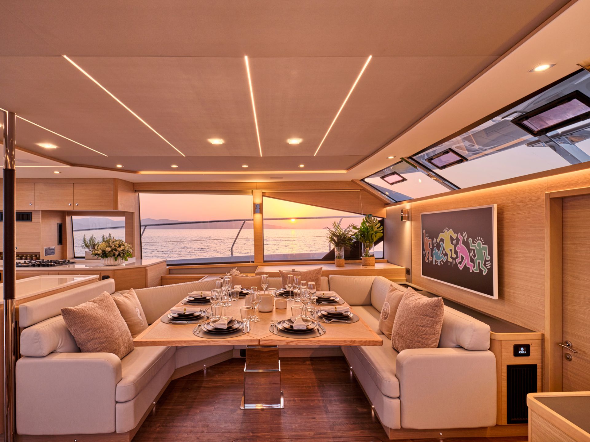 The unique layout of this catamaran presents a foredeck with two adjustable sun pads with sofas at the foot of the beds.