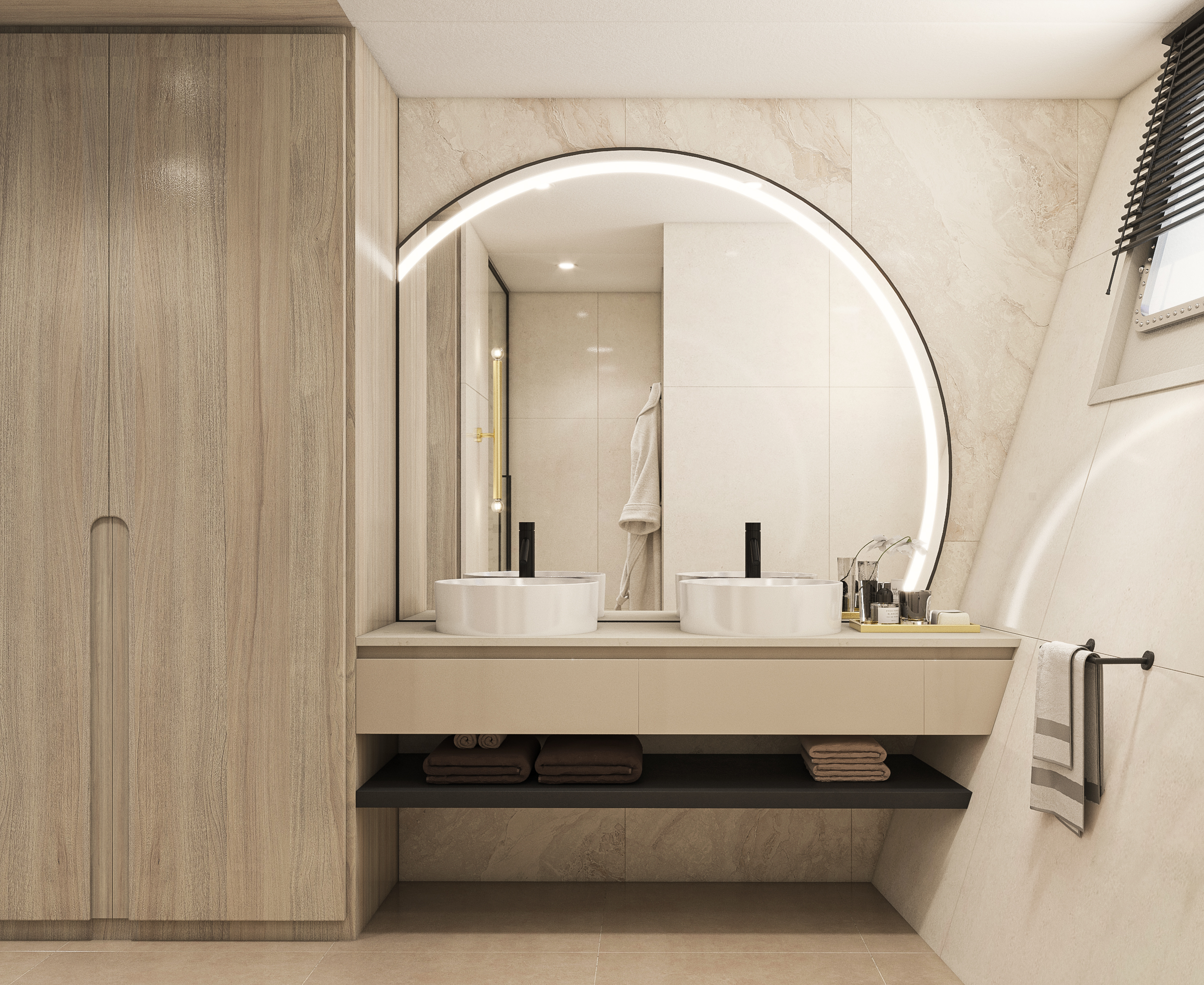 The six luxurious suites are configured as a full beam master, full beam VIP and four ensuite cabins amidships. The master and VIP are of equal size and both benefit from a lounge space as well as a first class ensuite bathroom.