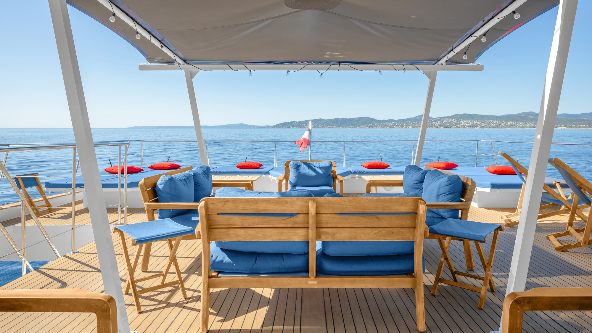 Sociable deck space includes a sun deck featuring a choice of seating arrangements with sofas, deck chairs and sunpads.