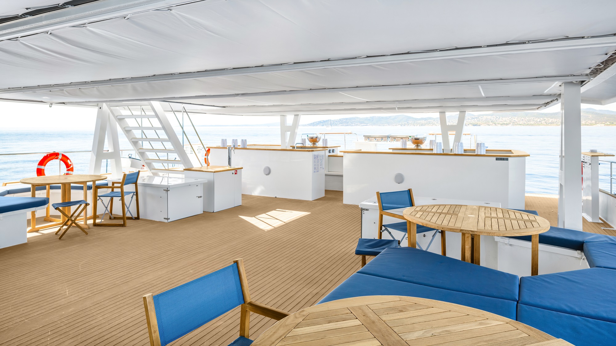 A large main deck is perfect for a party or corporate event and features plenty of comfortable deck furnishings.