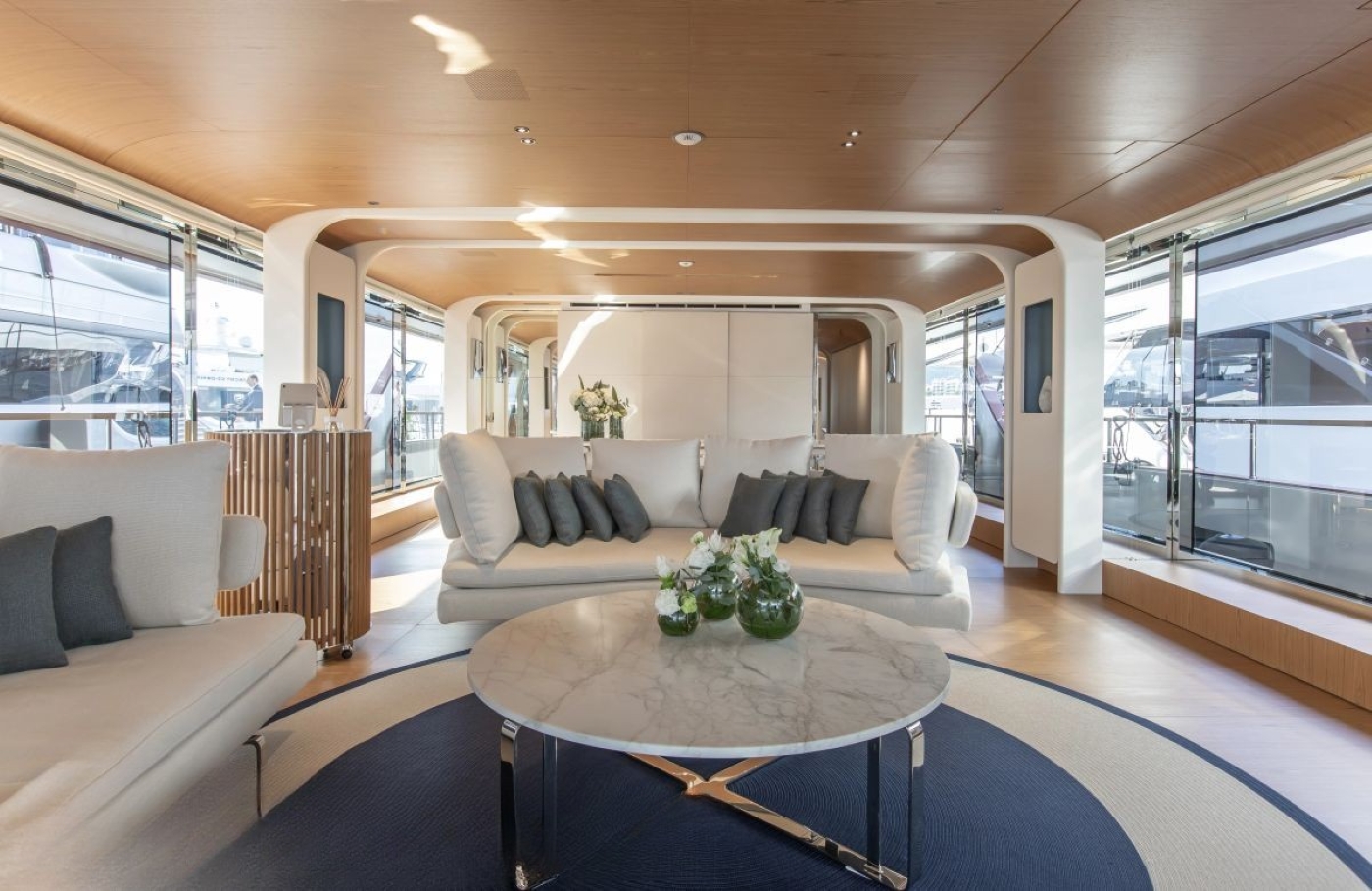 The spacious Hamptons-style beach club invites guests to relax in the sun at sea-level and features a retractable fabric canopy providing ample shade when needed; as well as a platform for easy access when enjoying the yacht's ...