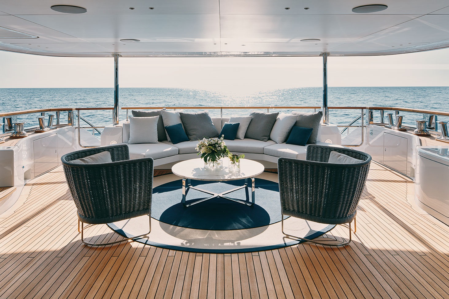 The upper deck aft is dedicated to dining and features a huge table and chairs plus the added bonus of a generous lounge space with opposing L-shaped sofas. Also on this level, the foredeck boasts a superb jacuzzi pool with a row of cushioned sun pads at one edge.