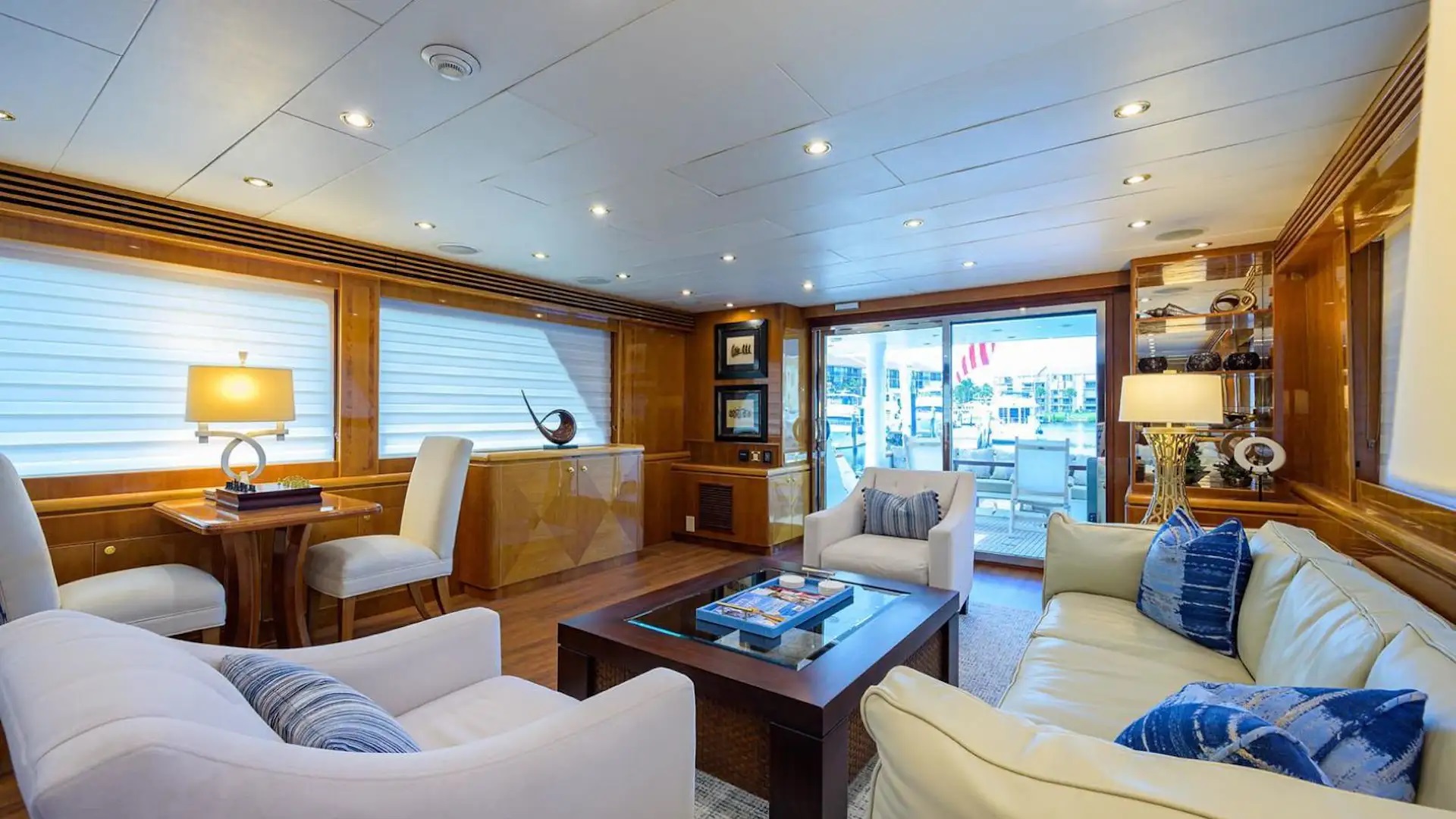 The interior has a traditional yet stylish aesthetic with light gloss wood panelling and neutral soft furnishings with blue highlights.