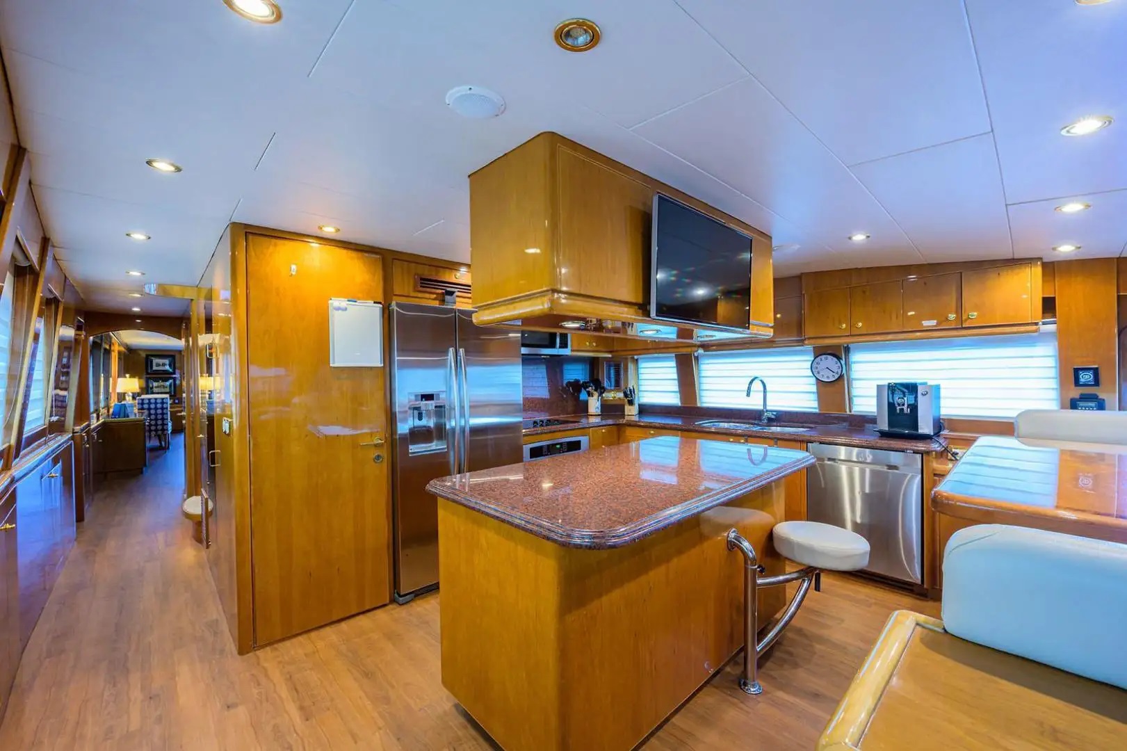 The guest suites are on the lower deck. The four lower deck suites can accommodate up to eight guests including a full beam master amidships, a forward VIP and two convertible cabins.