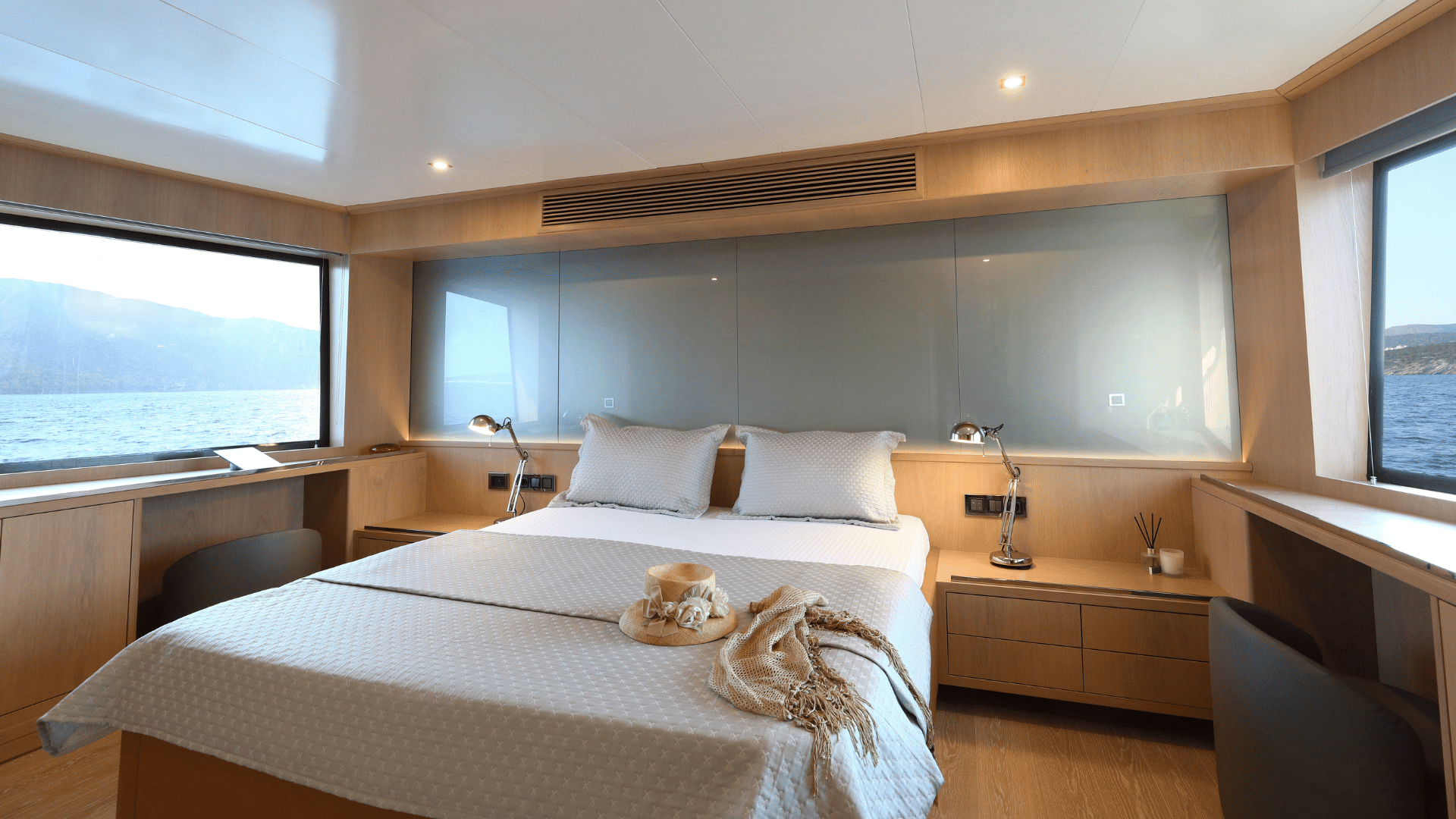 Her solid profile and plumb bow create a robust appeal with great exterior deck spaces.