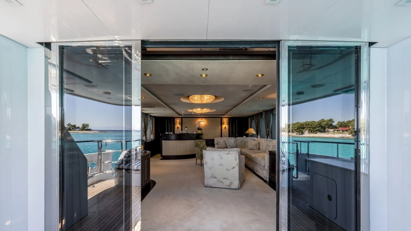 The main salon has a lavish feel with a luxury lounge area and bar decorated with rich fabrics and elegant furnishings. Glass doors lead out the aft deck thus seamlessly connecting the interior and exterior spaces.