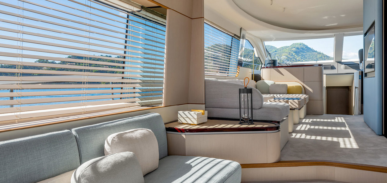 The sun deck has it all, a flexible dining area, sun pads both forward and aft and forward helm controls. The multi-purpose bow can be used for dining and lounging with adjustable seating which can be arranged to suit the occasion. A soft bimini is available to shade the space when the heat of the sun is at its height.