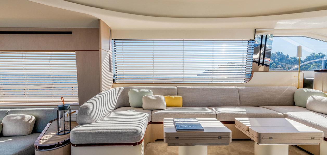 The sun deck has it all, a flexible dining area, sun pads both forward and aft and forward helm controls. The multi-purpose bow can be used for dining and lounging with adjustable seating which can be arranged to suit the occasion. A soft bimini is available to shade the space when the heat of the sun is at its height.