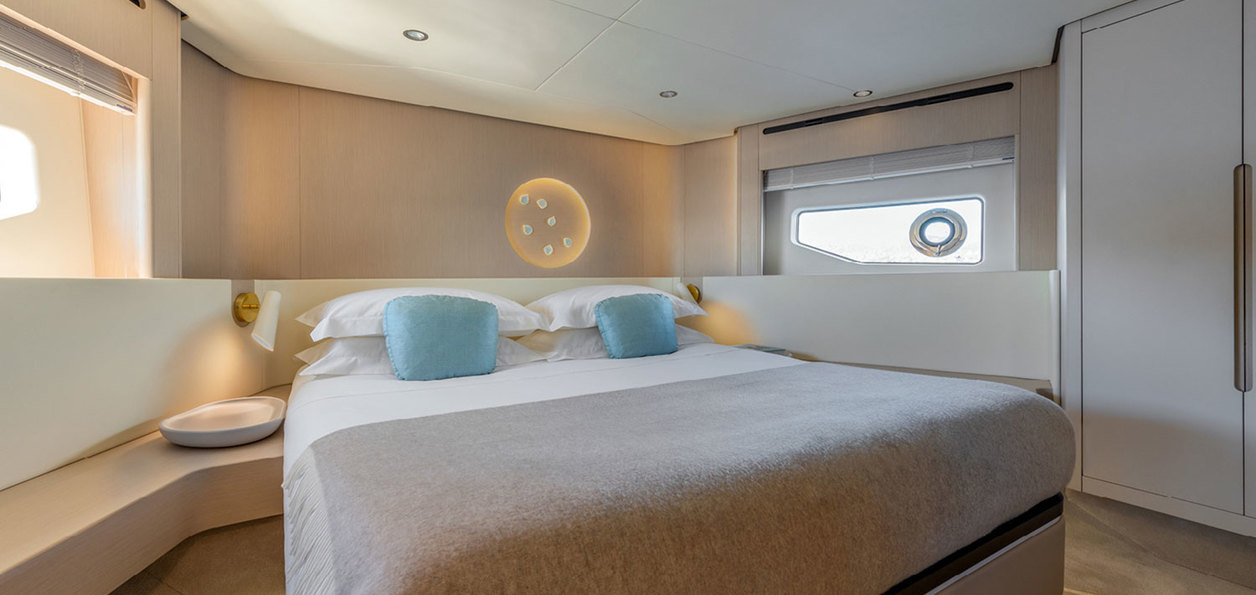 The guest suites are on the lower deck. The suites are beautifully light and bright and echo the same colour scheme as the main deck areas. They are configured as one master, one VIP and two twin (one is a bunk room) all with contemporary ensuite bathroom facilities.