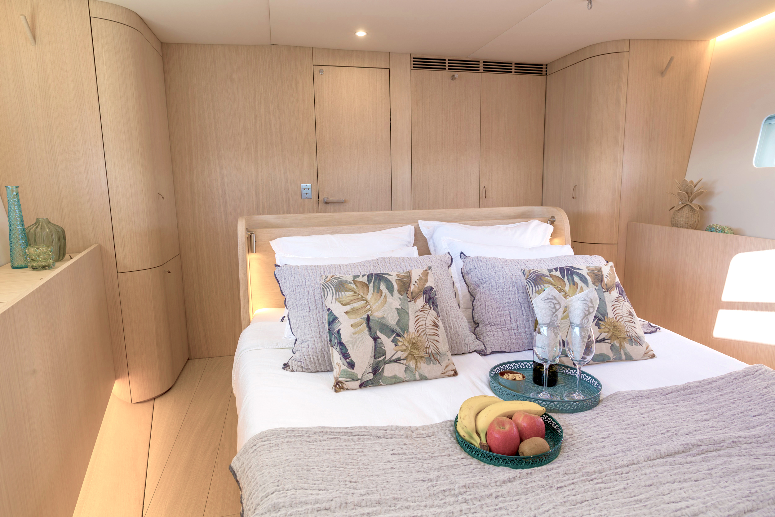 The generous master suite is forward with an ensuite bathroom while the two twin cabins are aft, also with the privacy of their own ensuite bathrooms.