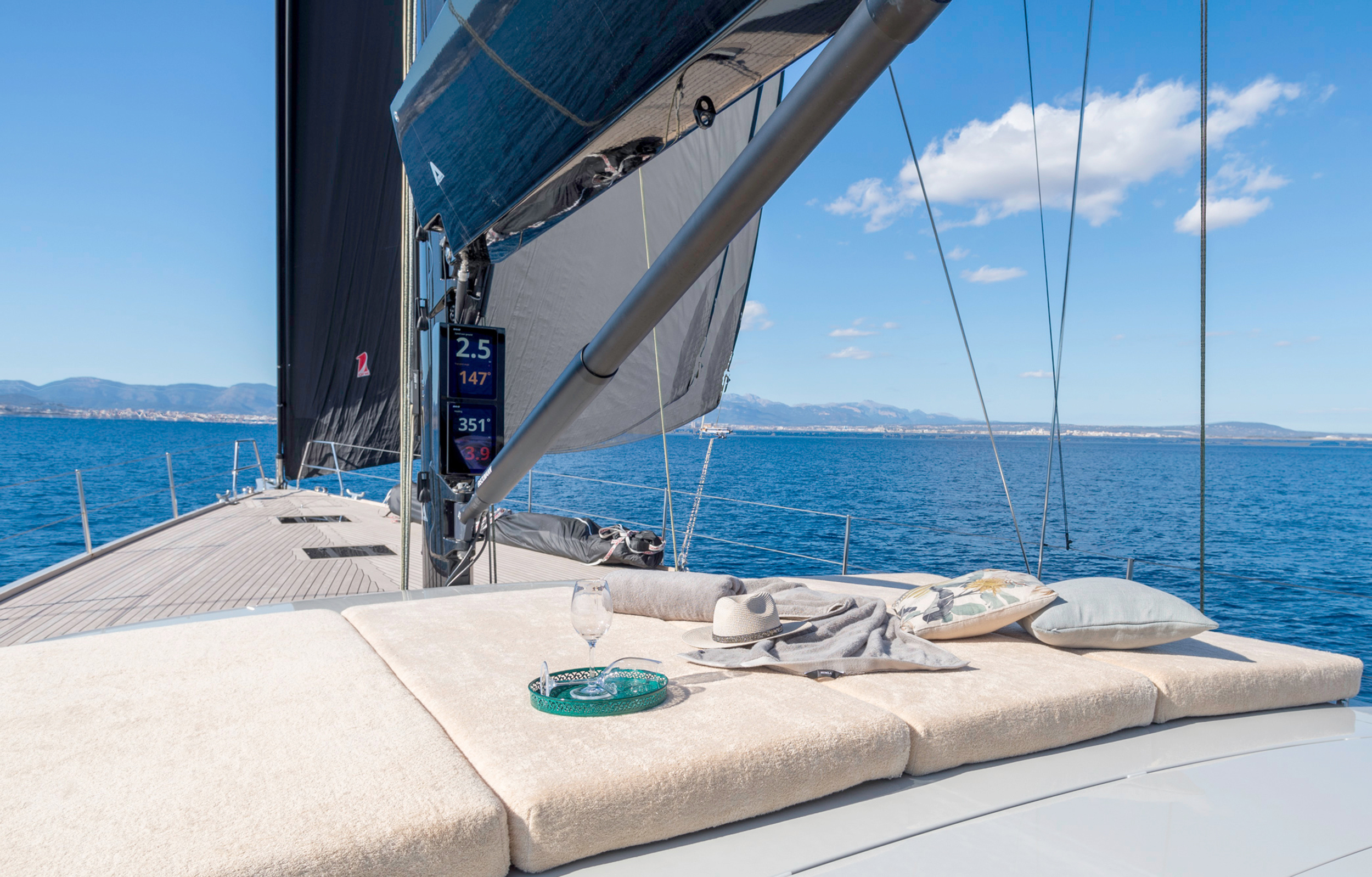 The cool and elegant interior offers a dining setting and sofa area plus an integrated galley. The seating is comfortable blending curved edges with plush neutral soft furnishings.