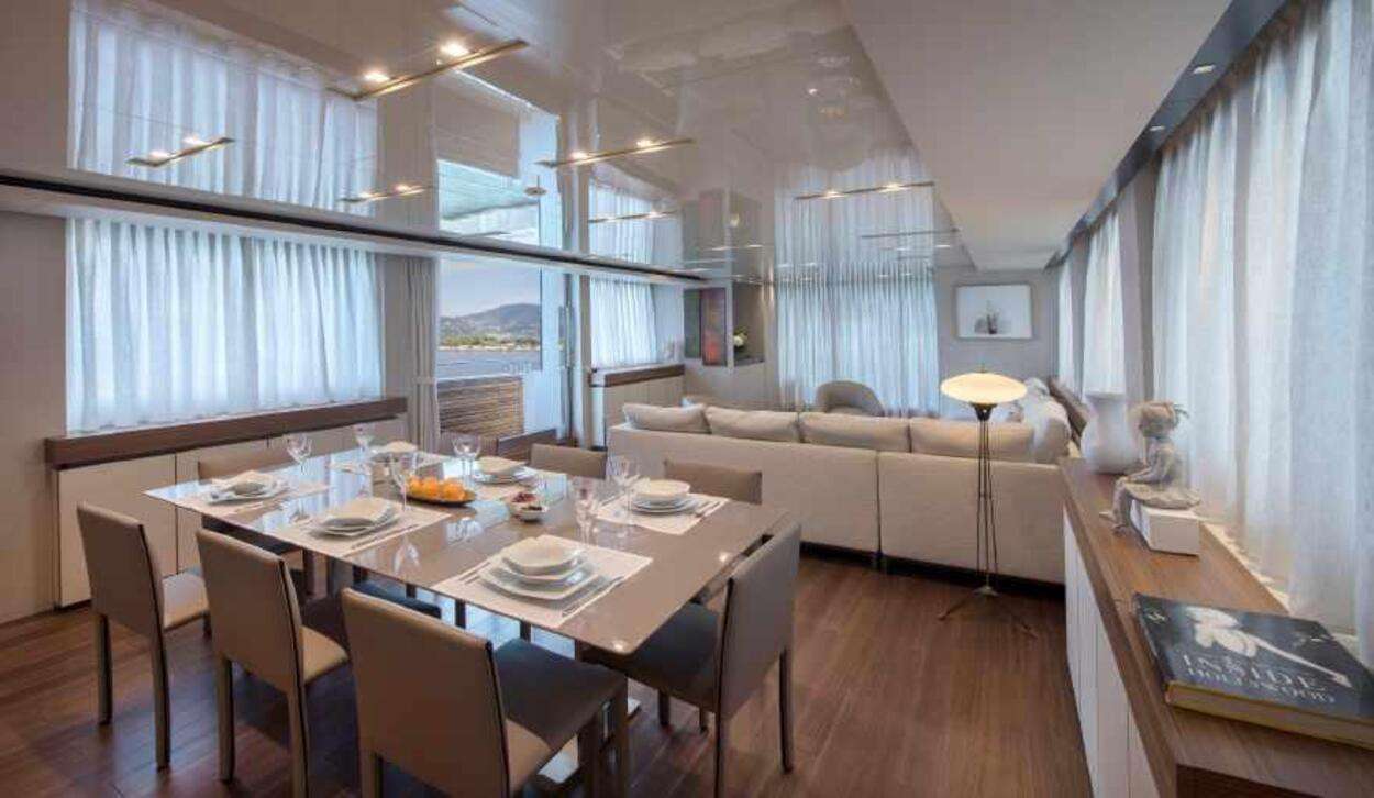 There is a dining setting forward with helm controls further forward, all covered by a hard bimini – with a retractable section. On the main deck master guests can relax around two flexible tables which can be used for drinks or dinner and take the steps down to the swim platform – extended when the transom door is opened.