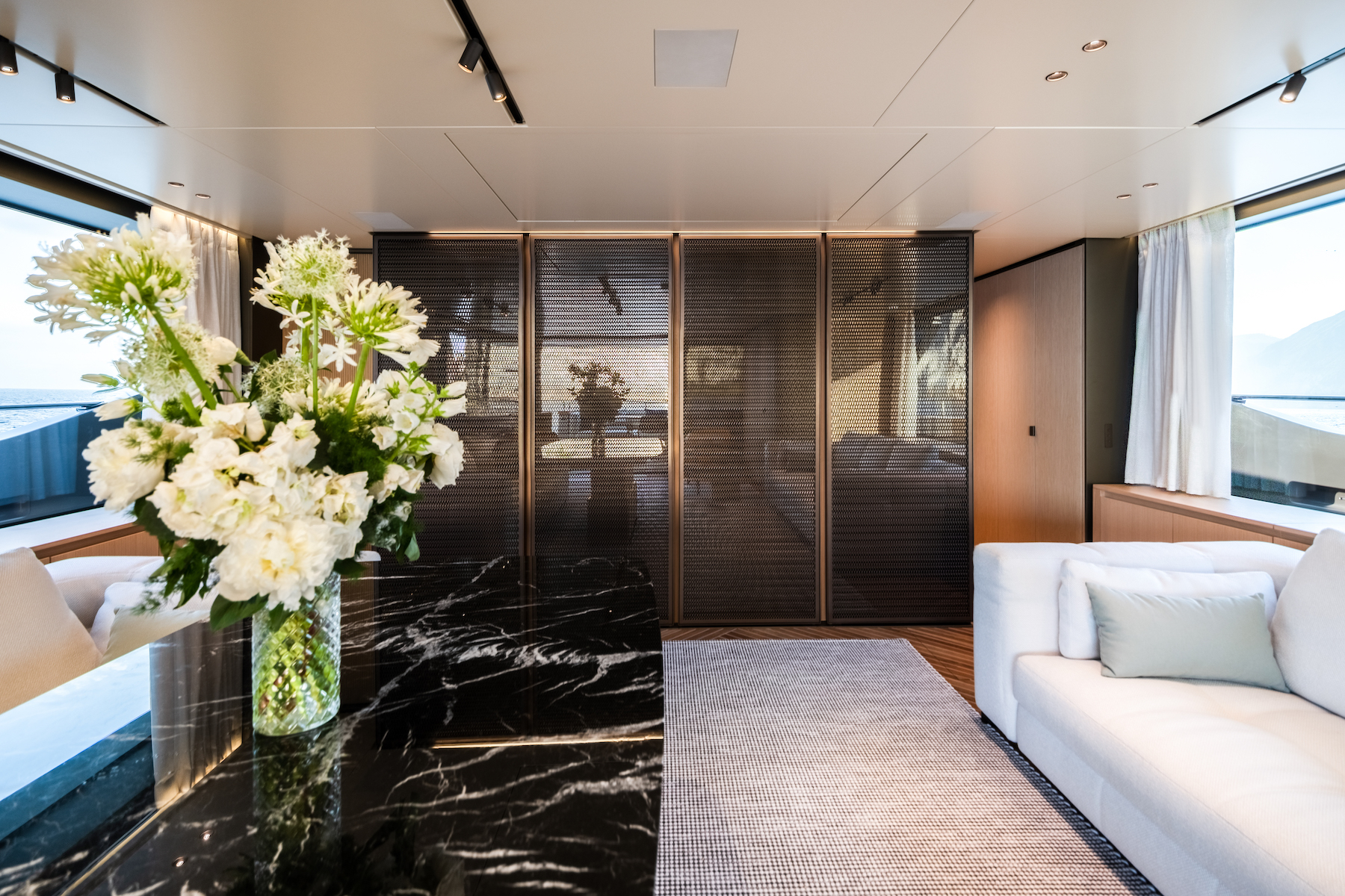 She offers accommodation to up to 8 guests in 4 cabins: The Owner’s suite on the main deck, two double guest cabins and an additional double cabin in front of the descent staircase conceived as a little cabin that can be converted into a lounge area. All cabins are ensuite.